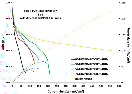 The electrochemical performance of membrane electrode assemblies, prepared with my blend membranes, was evaluated. The performance tests of membranes were performed using a single cell under controlled conditions at 80 °C and 80% humidity for both H2 and O2. Figure 11 presents the polarization and power density curves. The results show that the SPP membrane with 3% TiO2PO4 has the best current and power density of 175.5 mA/cm2 and 61.52 mW/cm2, respectively. It is the best membrane for fuel cell (FC) applications among all SPP membranes tested. The agreement between the ion exchange capacity (IEC) results, water uptake measurements, and SEM images predicted this excellent performance. Fine distribution of the nanofiller, good compatibility and miscibility of constituents, hydrophilicity, and the presence of proton exchange sites in high concentration proved to be a prerequisite to obtain a good membrane.
