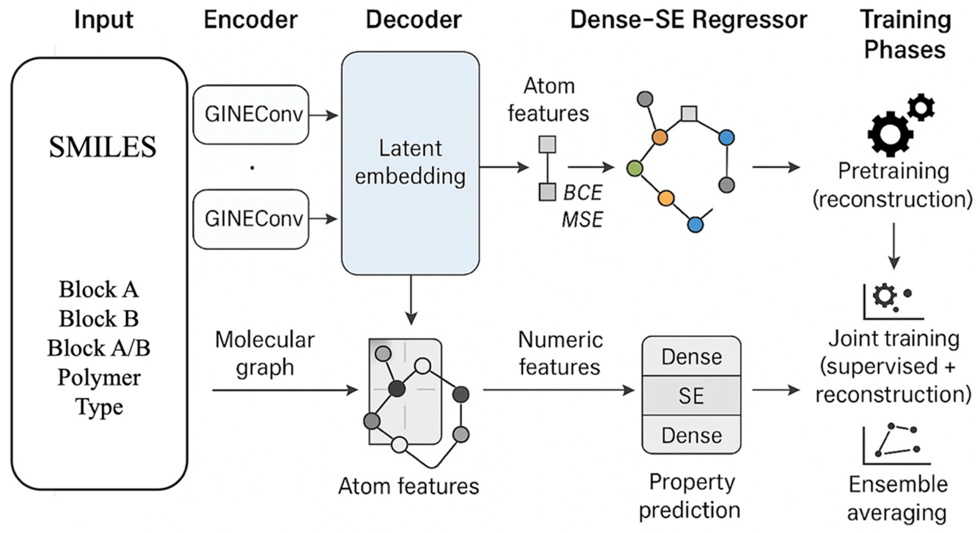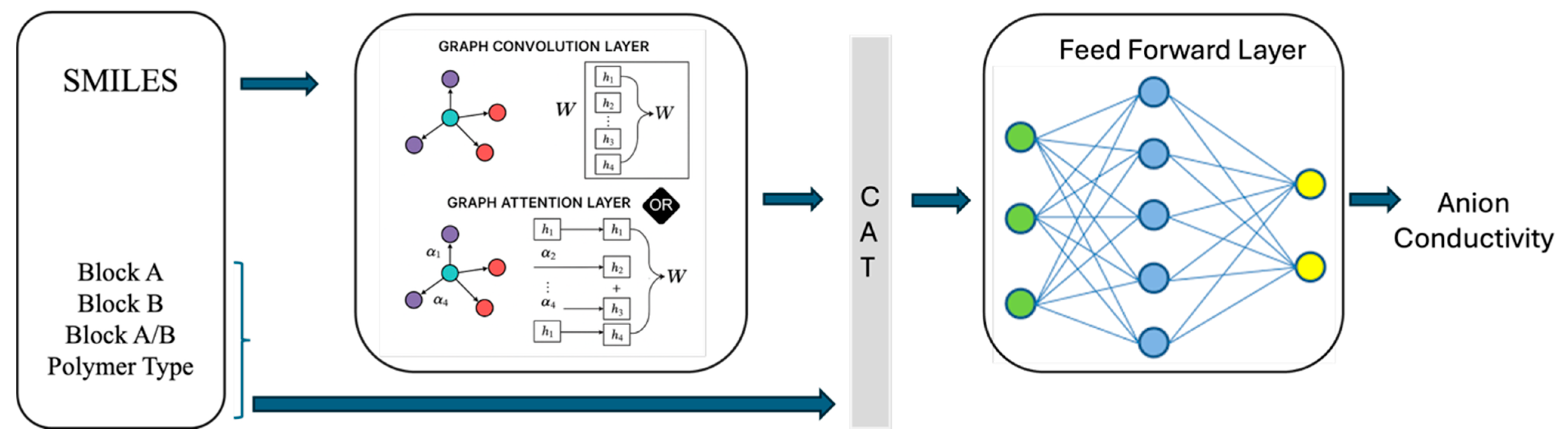 - Tailored architecture for polymer descriptors: Unlike prior small-molecule GNN-AEs, HGARE handles block–copolymer graphs with repeating-unit expansion and cross-link representations. The HGARE framework effectively integrates the structural interpretability of graph neural networks with the representational flexibility of dense architectures, thereby leveraging both molecular topology and global physicochemical descriptors. The combination of autoencoder pretraining, joint fine-tuning, and ensemble averaging results in stable, accurate, and chemically consistent predictions of anion conductivity in AEMs. Consequently, HGARE represents a robust and generalizable modeling paradigm for polymer informatics and data-driven materials discovery.