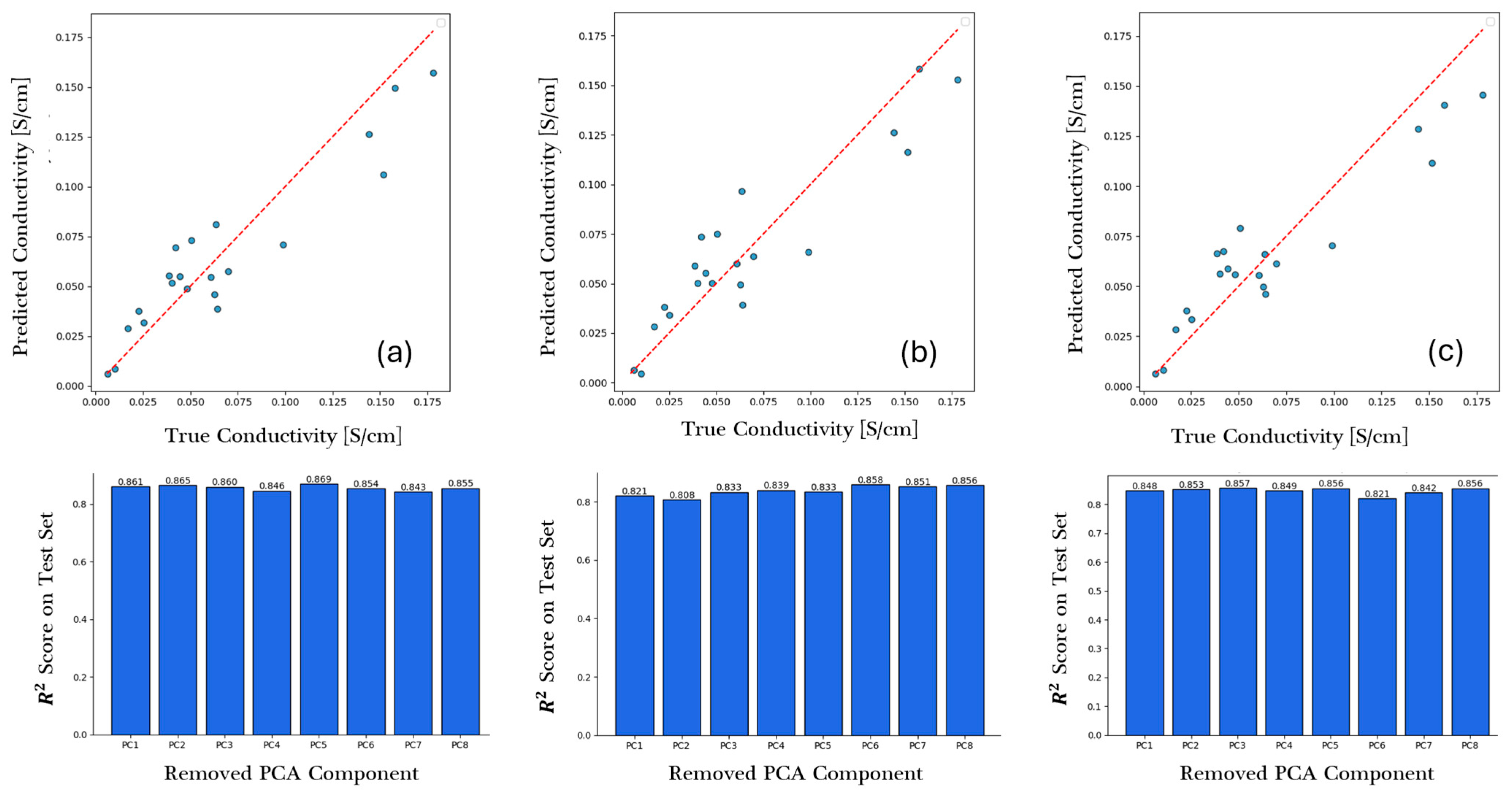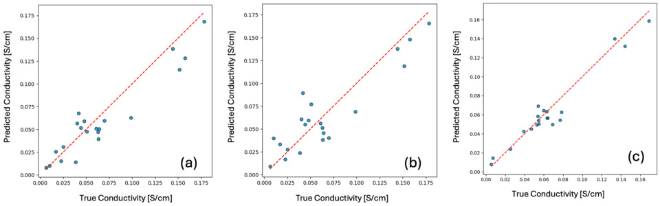 - Macromolecular topology and polarity (PC1-PC2): These components describe overall molecular size, branching, complexity, and hydrophobic–hydrophilic balance. Their strong influence, particularly in the XGboost model, highlights the morphological continuity of hydrophilic domains and the distribution of polar functional groups primary enablers of ion transport. Well-connected polymer backbones with balanced polarity facilitate continuous ion channels, enhancing charge mobility.