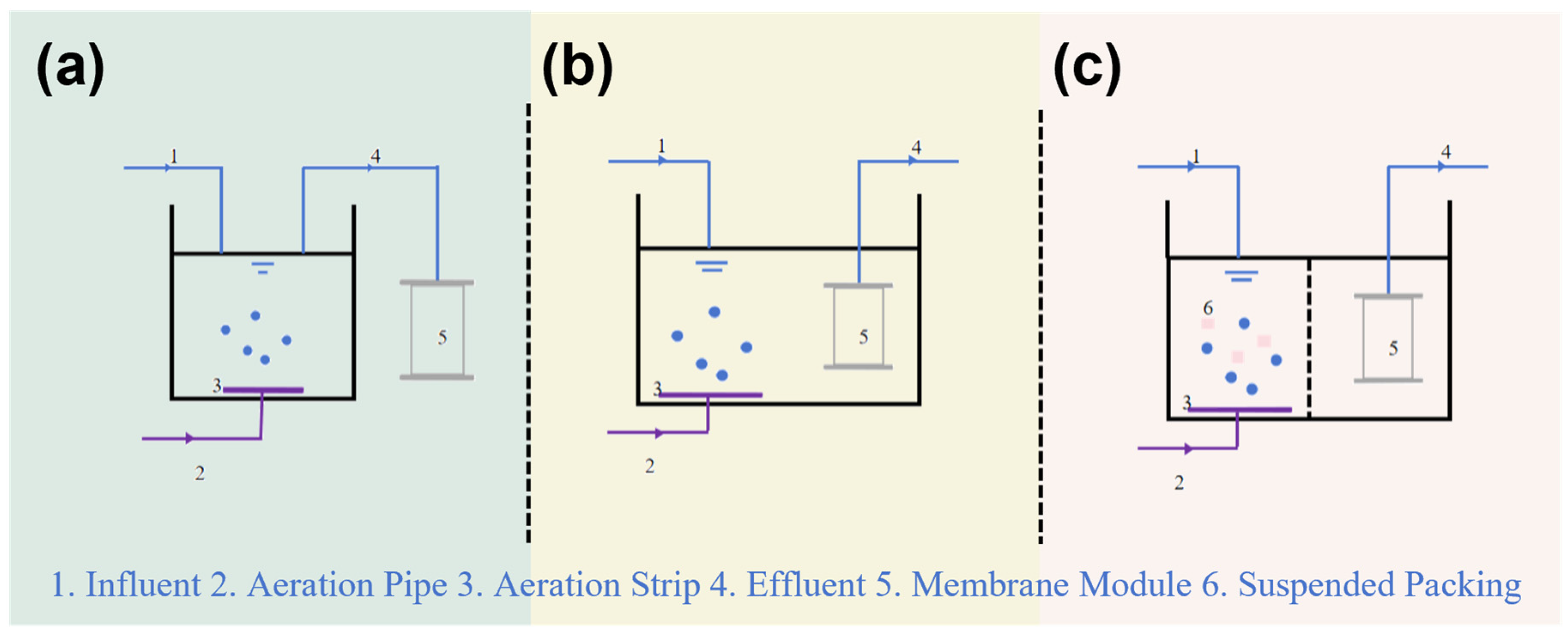 - Wang, L.; Zhang, C.; Liu, Y.; Qiu, Y.; Wanyan, D.; Liu, J.; Cheng, G.; Lin, P.; Huang, X. Achieving Mainstream Nitrogen Removal by Partial Nitrification and Anammox in the Carriers-Coupled Membrane Aerated Biofilm Reactor. Water Res. 2025, 271, 123000. [Google Scholar] [CrossRef] [PubMed]
