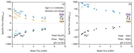 The specific fluxes per ion in absolute electron equivalents (mEq/LFLux) plotted against the water flux for feed solutes (a) Na2SO4 and (b) NaCl. The direction of transfer is indicated by the sign, with the feed to the draw solution being the positive direction.
