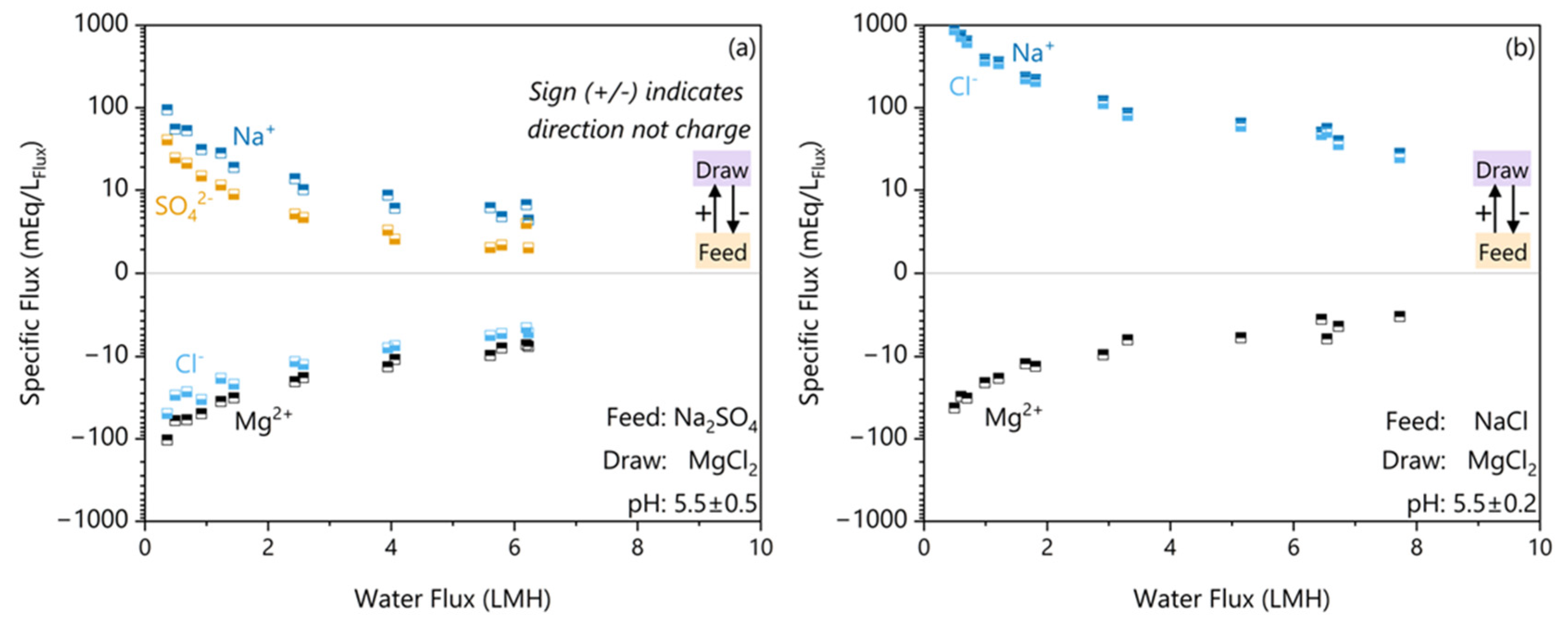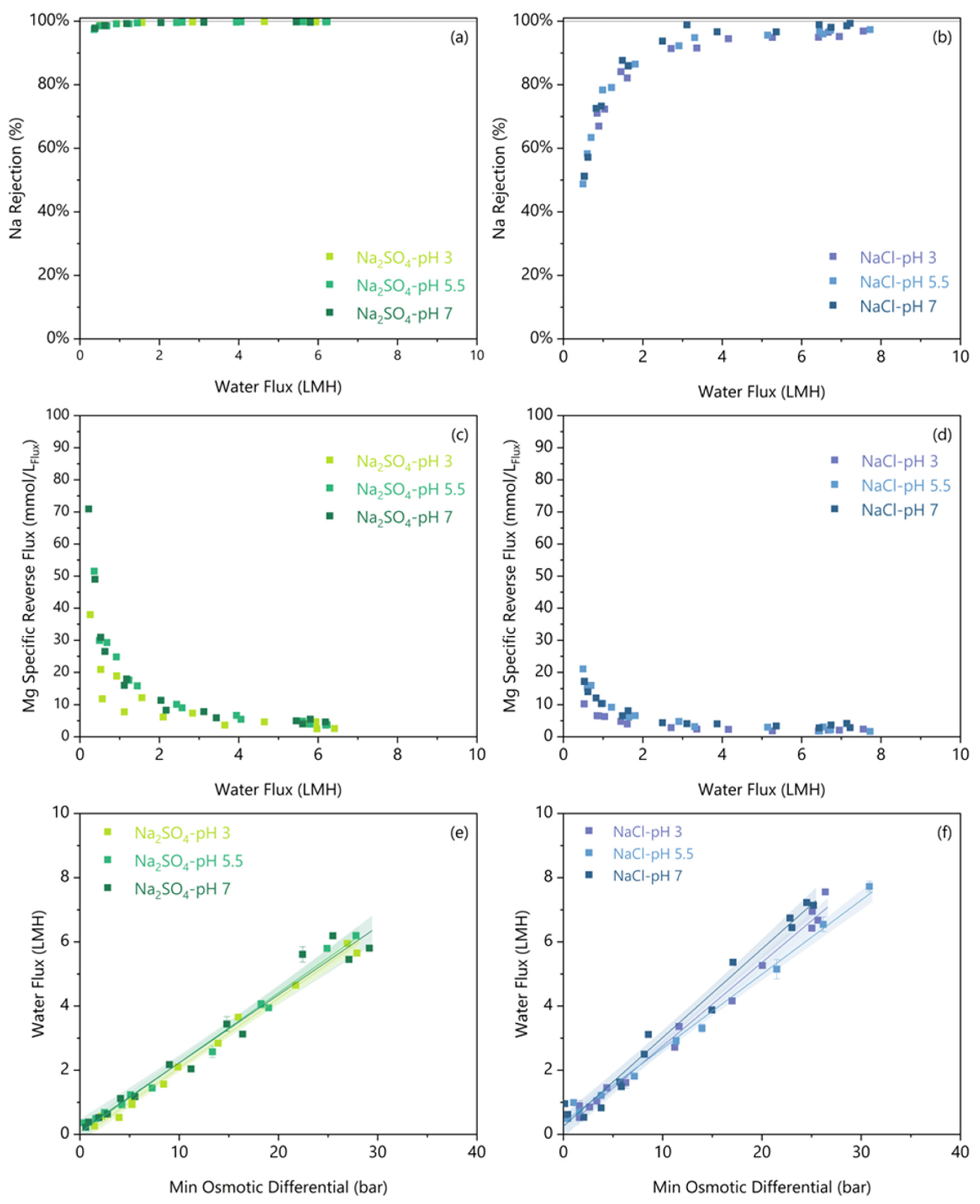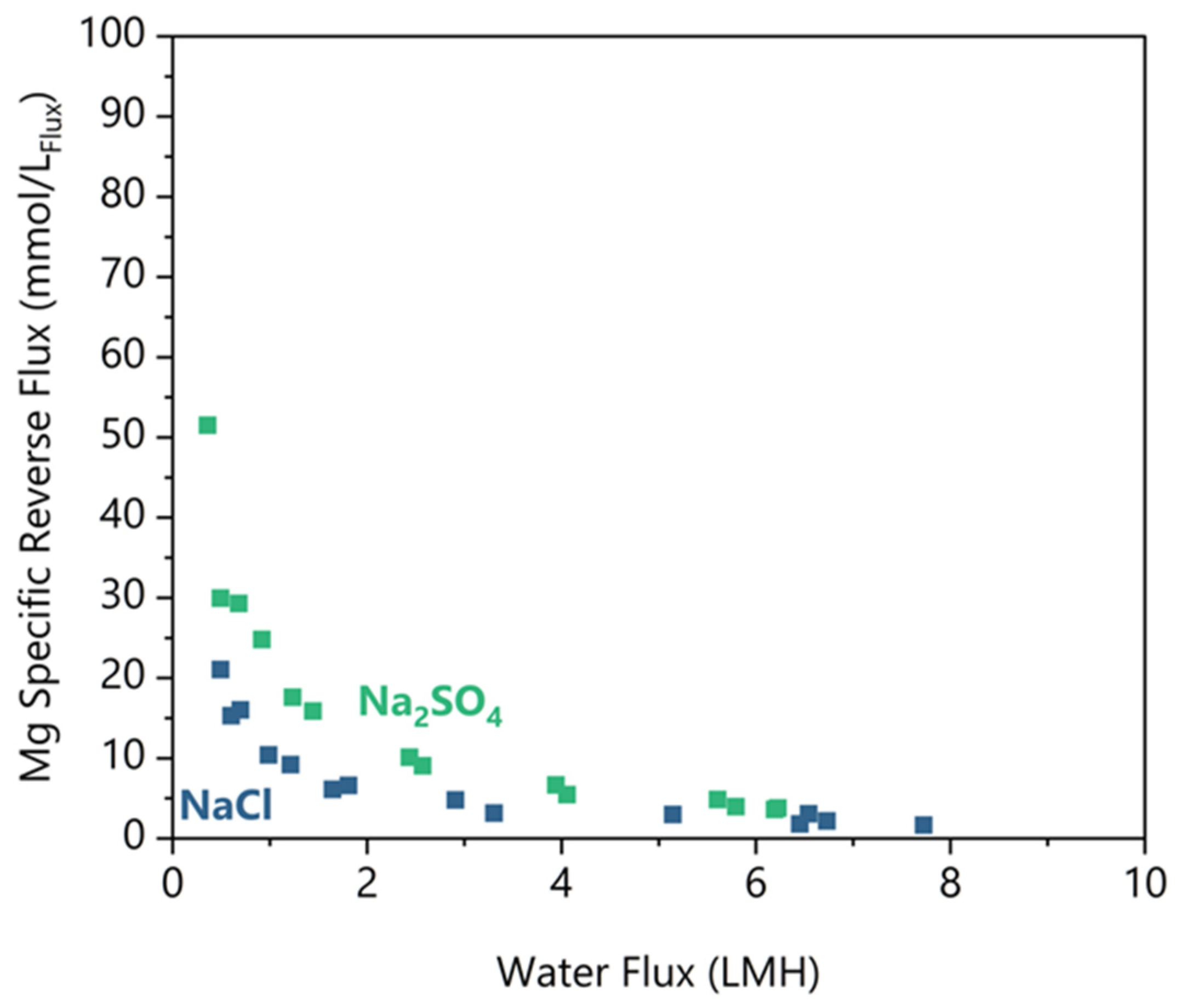| Solute | Initial pH | Na Rejection (%) | Min. Water Flux * (LMH) | Specific Mg Flux (mmolMg/LFlux) | Min. Water Flux ** (LMH) | Δπmin (bar) |