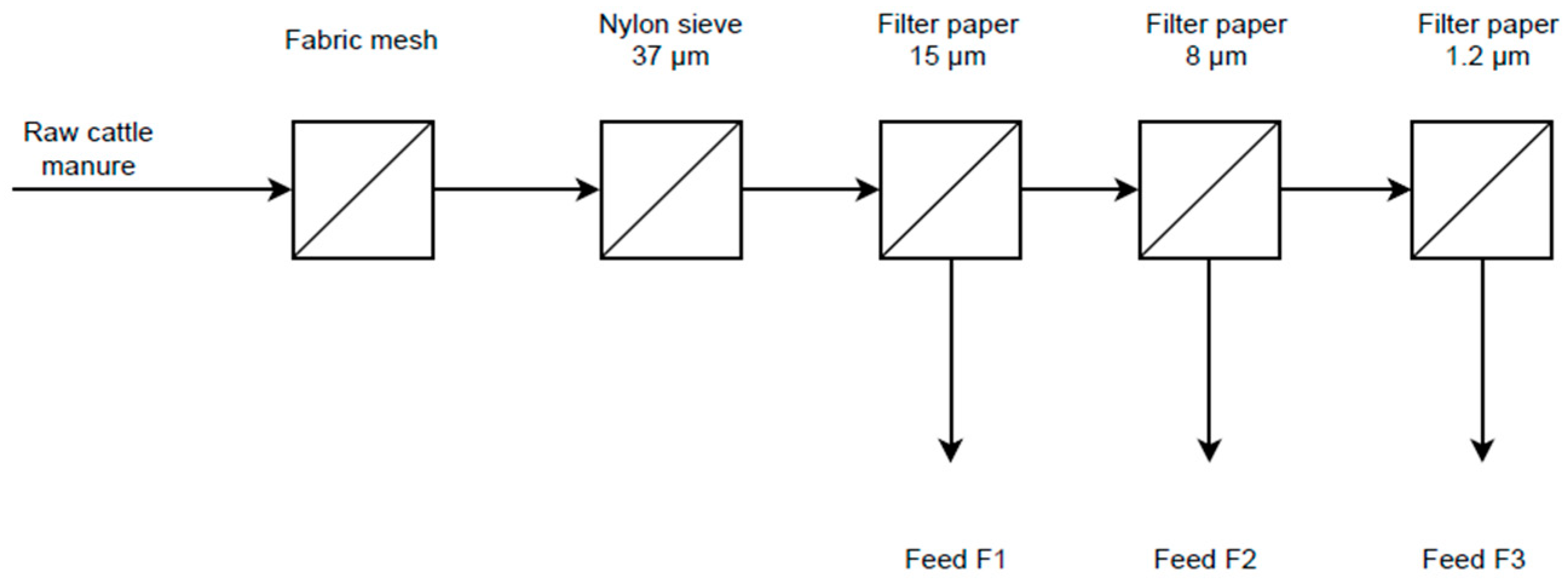 The manure was initially passed through a stainless-steel electric-driven tomato strainer (VEVOR, Suzhou, China) as a screw press (mesh size 1.5 mm) and was then subsequently filtered using progressively smaller filter sizes. The filters used had pore sizes of 37 μm, 15 µm, 8 µm, and 1.2 µm.