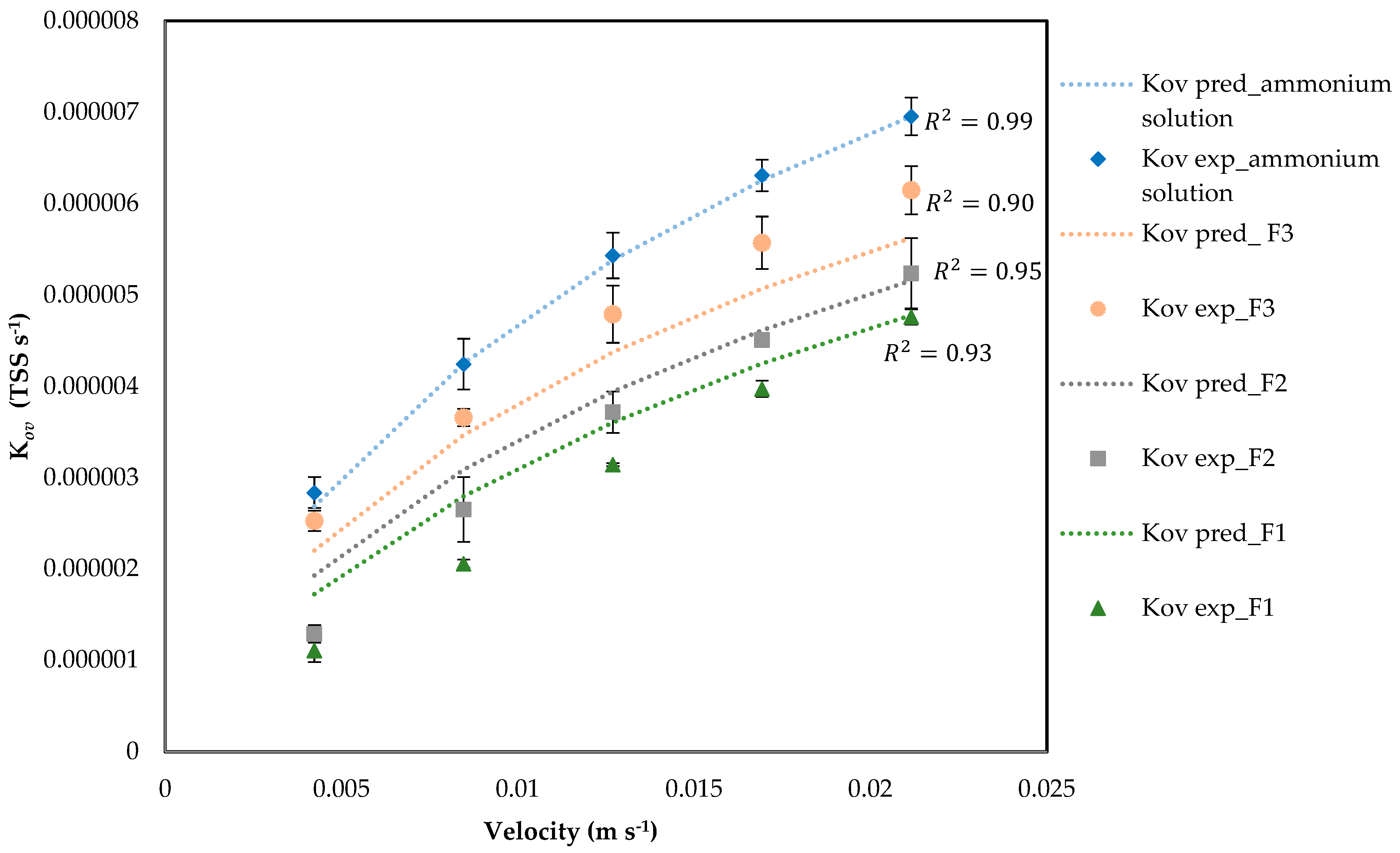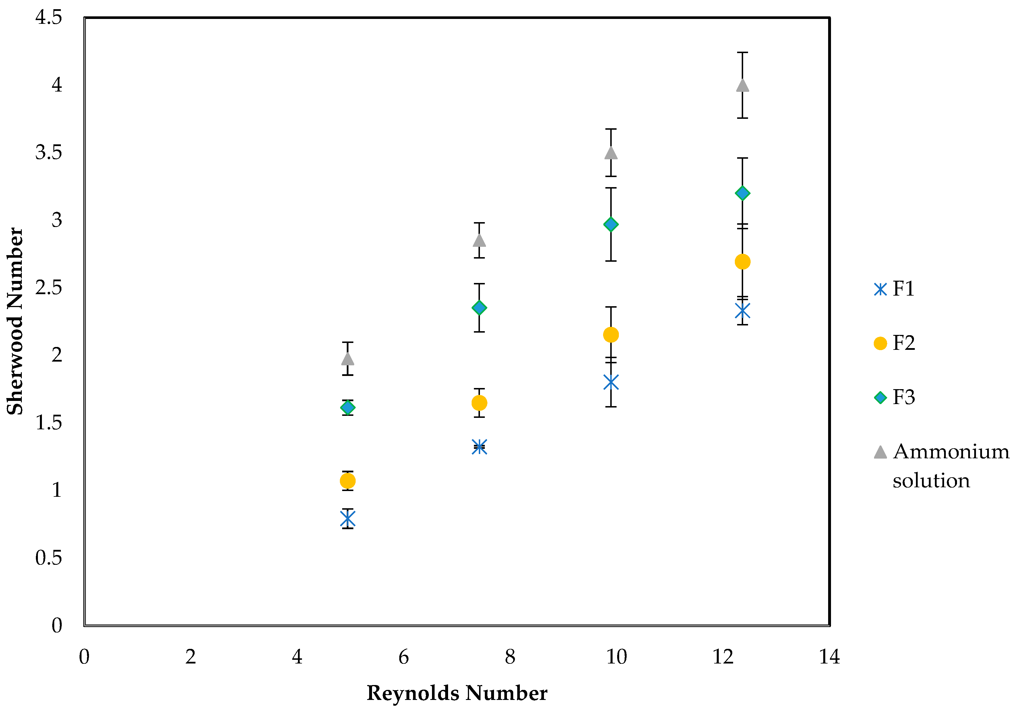 TSS concentrations. It can be observed that increasing TSS concentrations lead to a reduction in the Sh number for a given Re number. Fitted linear correlations between Sh and Re show that F1, F2, and F3 are almost parallel with the slope of approx. 0.21, while the ammonium solution has a slope of 0.27. This shows that the predictions correlate very well with experimental results. When the parameters Sh vs. Re are plotted, the data points corresponding to the lowest Re of 2.47 were omitted from the