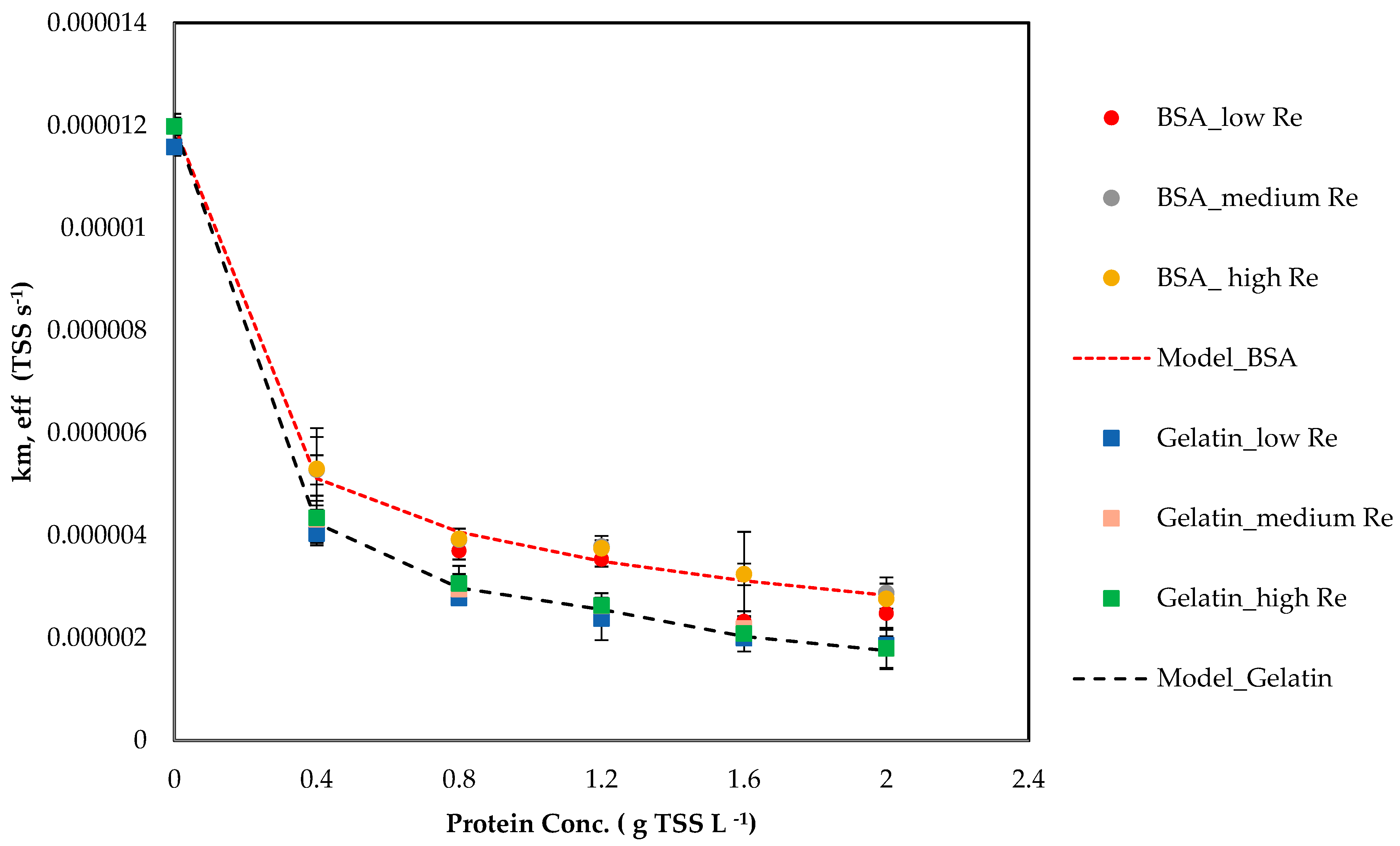 km,eff,exp decreasing with increasing protein concentrations, for both BSA and gelatin. No impact of a change in