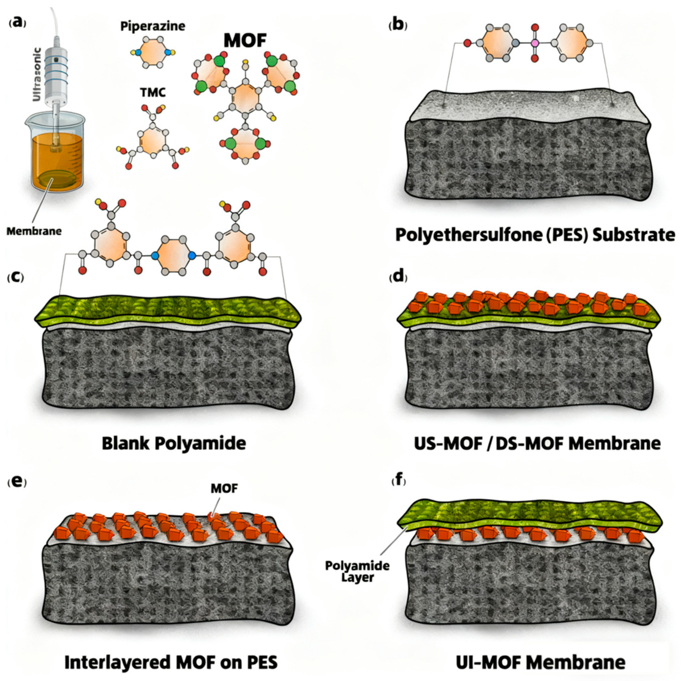 - Koli, M.; Kanwar, B.; Wickramasinghe, S.R.; Singh, S.P. Tailoring nanofiltration membranes with MOF 303 modified support layer for enhanced PFAS and heavy metal separation. Desalination 2025, 616, 119392. [Google Scholar] [CrossRef]