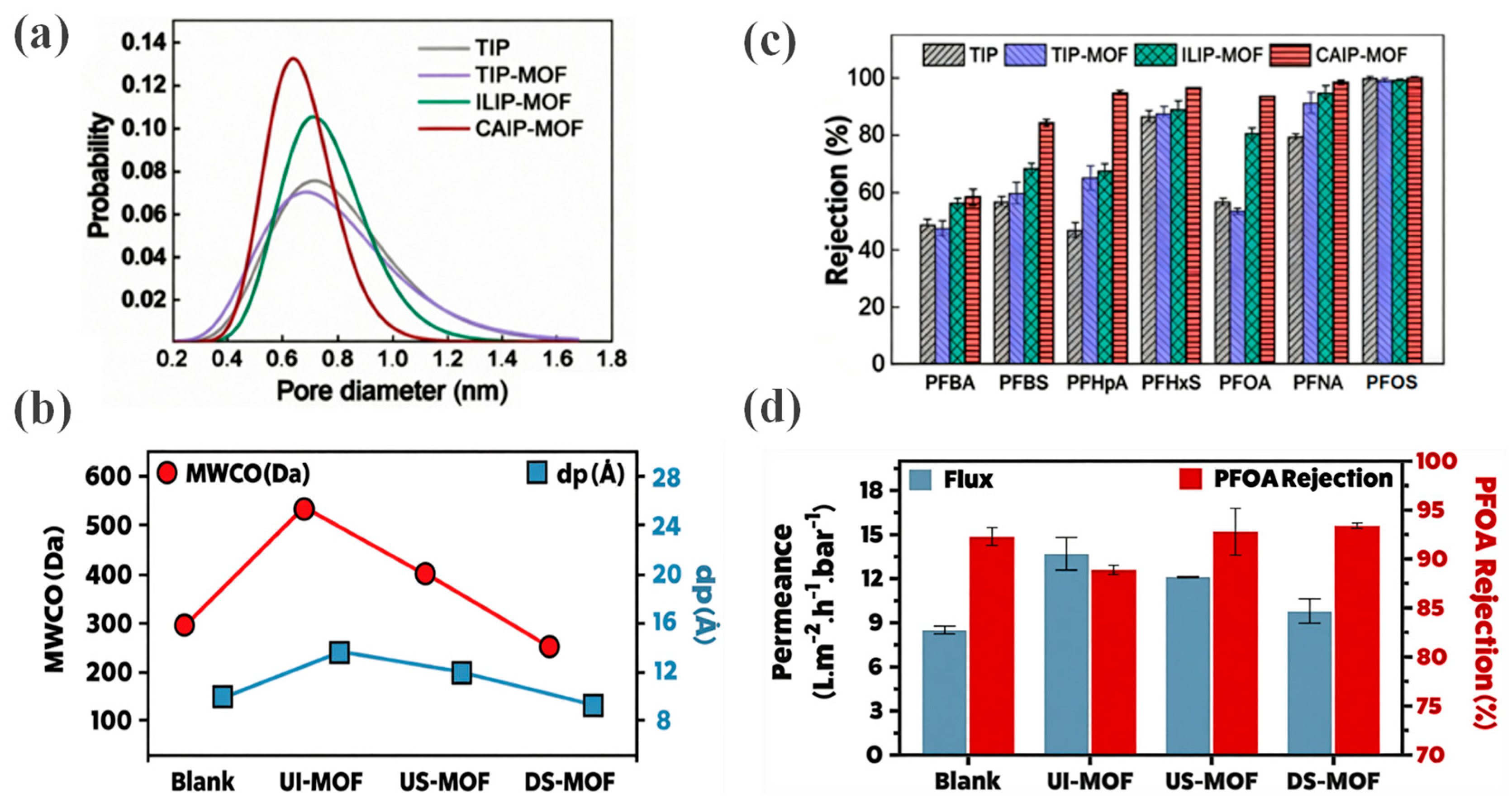 | MOF-303-TFC | MOF | PFOS, PFOA a | 92.1 ± 0.6, 91.8 ± 0.6 | 7.91–14.72 | Size Exclusion, Electrostatics | [42] |