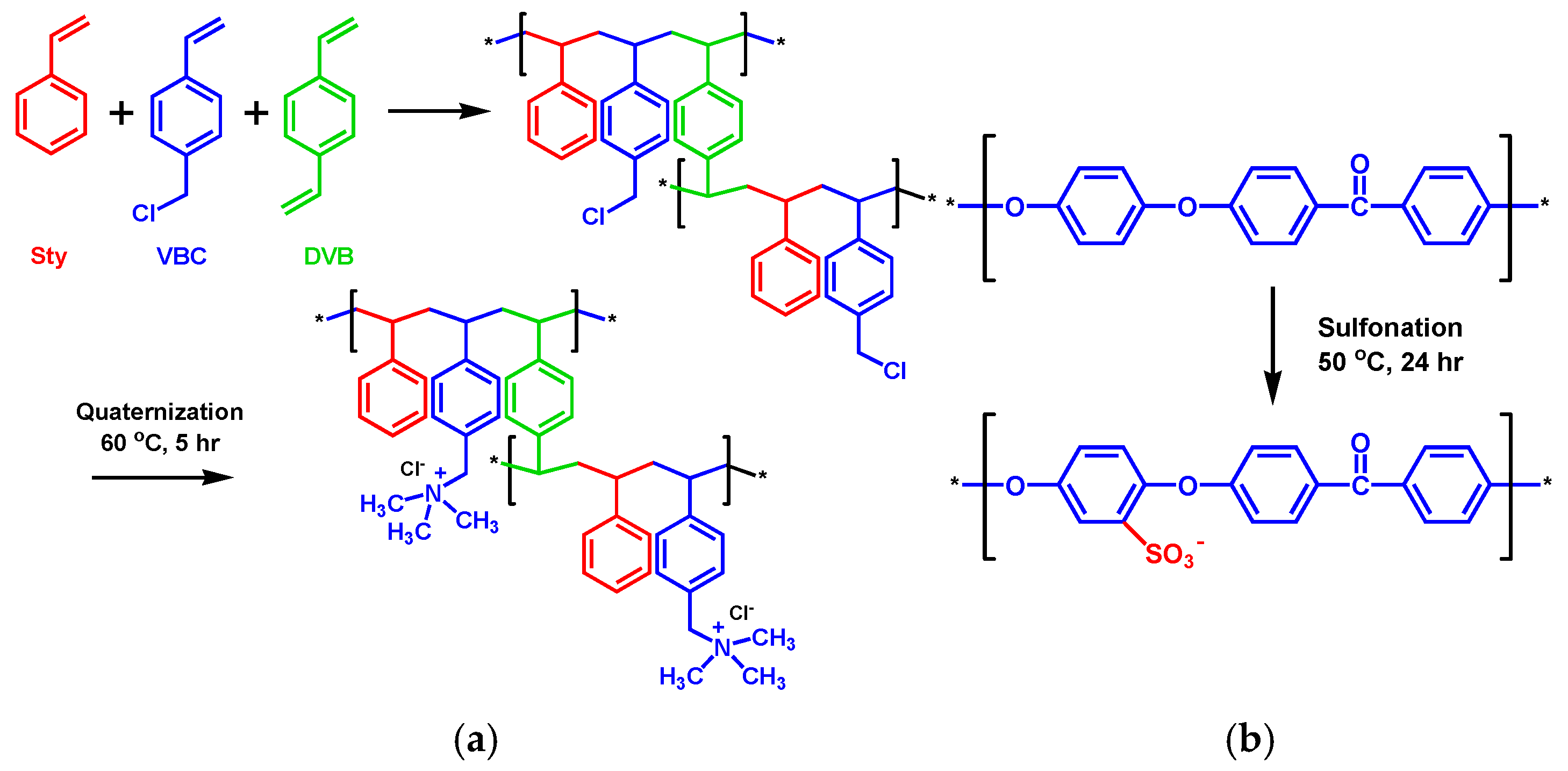 - Vengatesan, S.; Santhi, S.; Jeevanantham, S.; Sozhan, G. Quaternized poly (styrene-co-vinylbenzyl chloride) anion exchange membranes for alkaline water electrolysers. J. Power Sources 2015, 284, 361–368. [Google Scholar] [CrossRef]