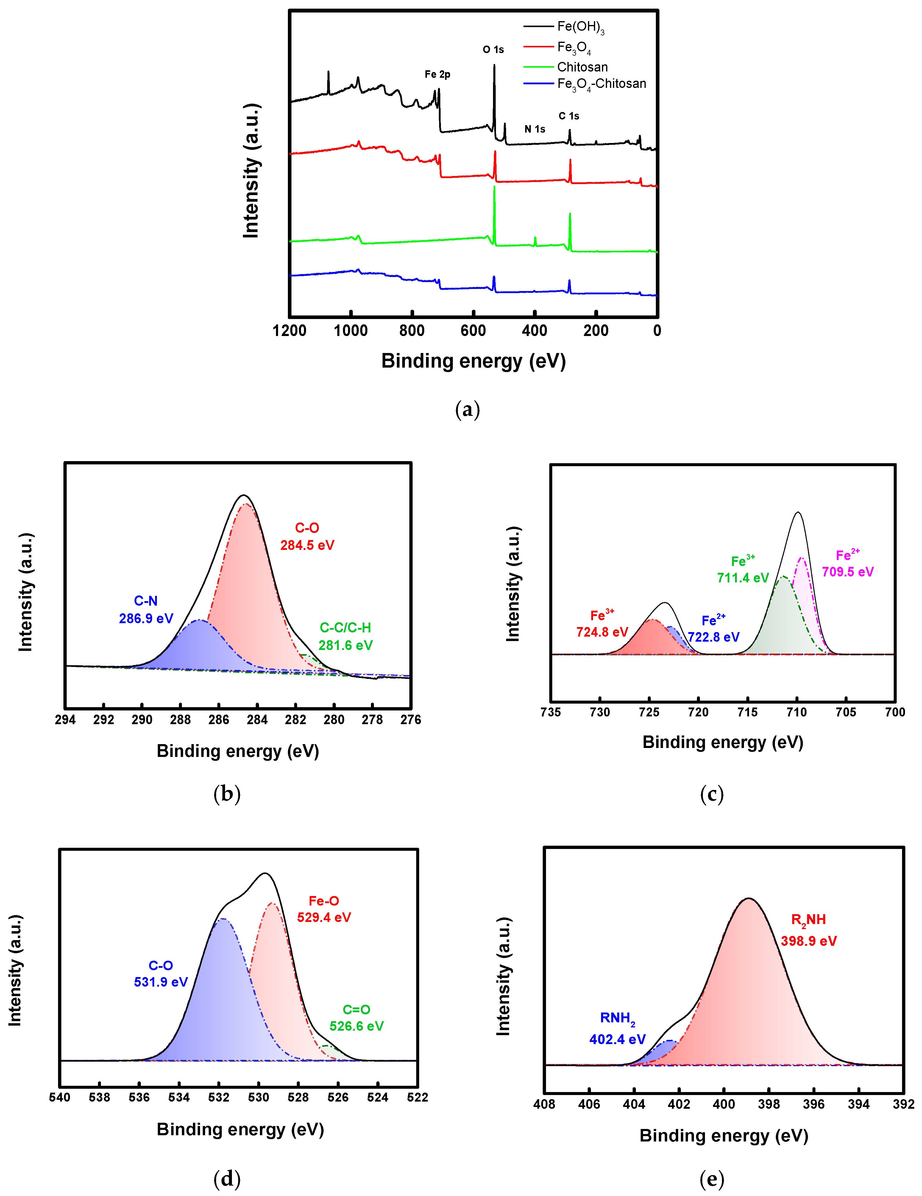 2.3. Fe(OH)3 and Fe3O4-Chitosan Core–Shell Catalysts Fabrication