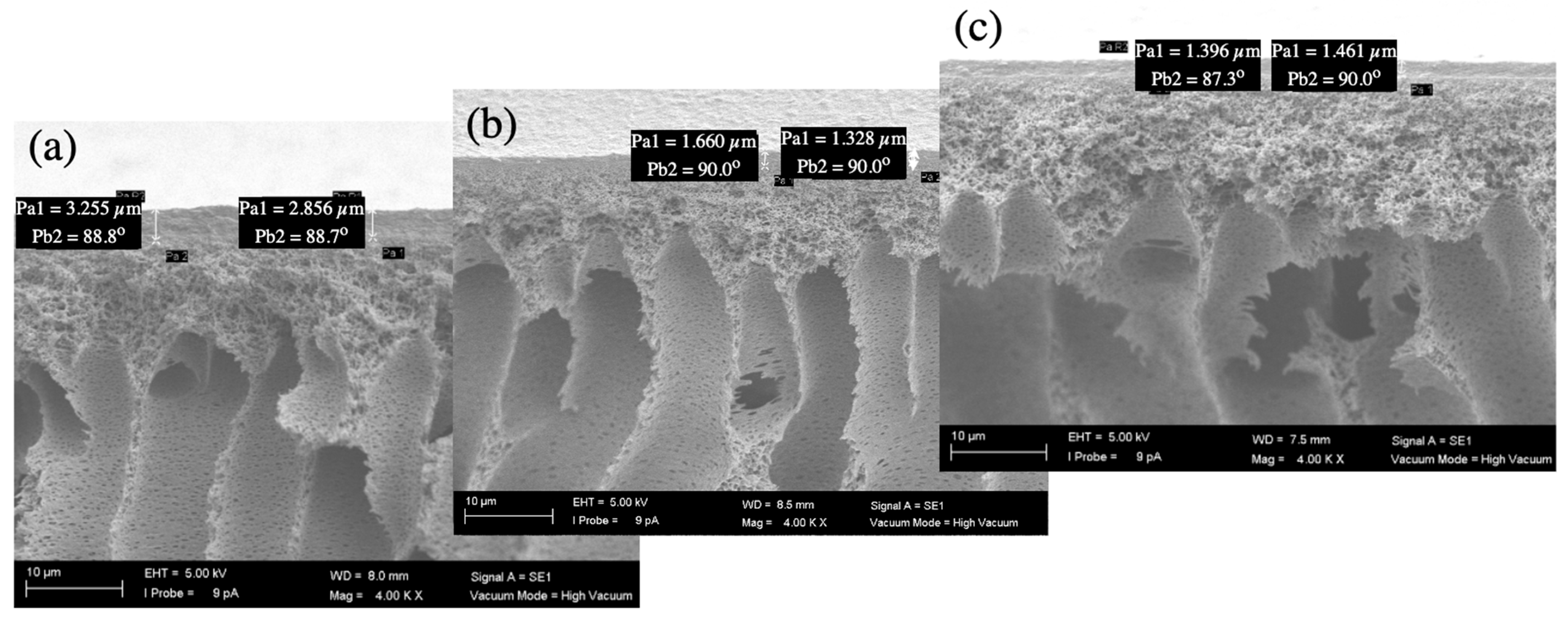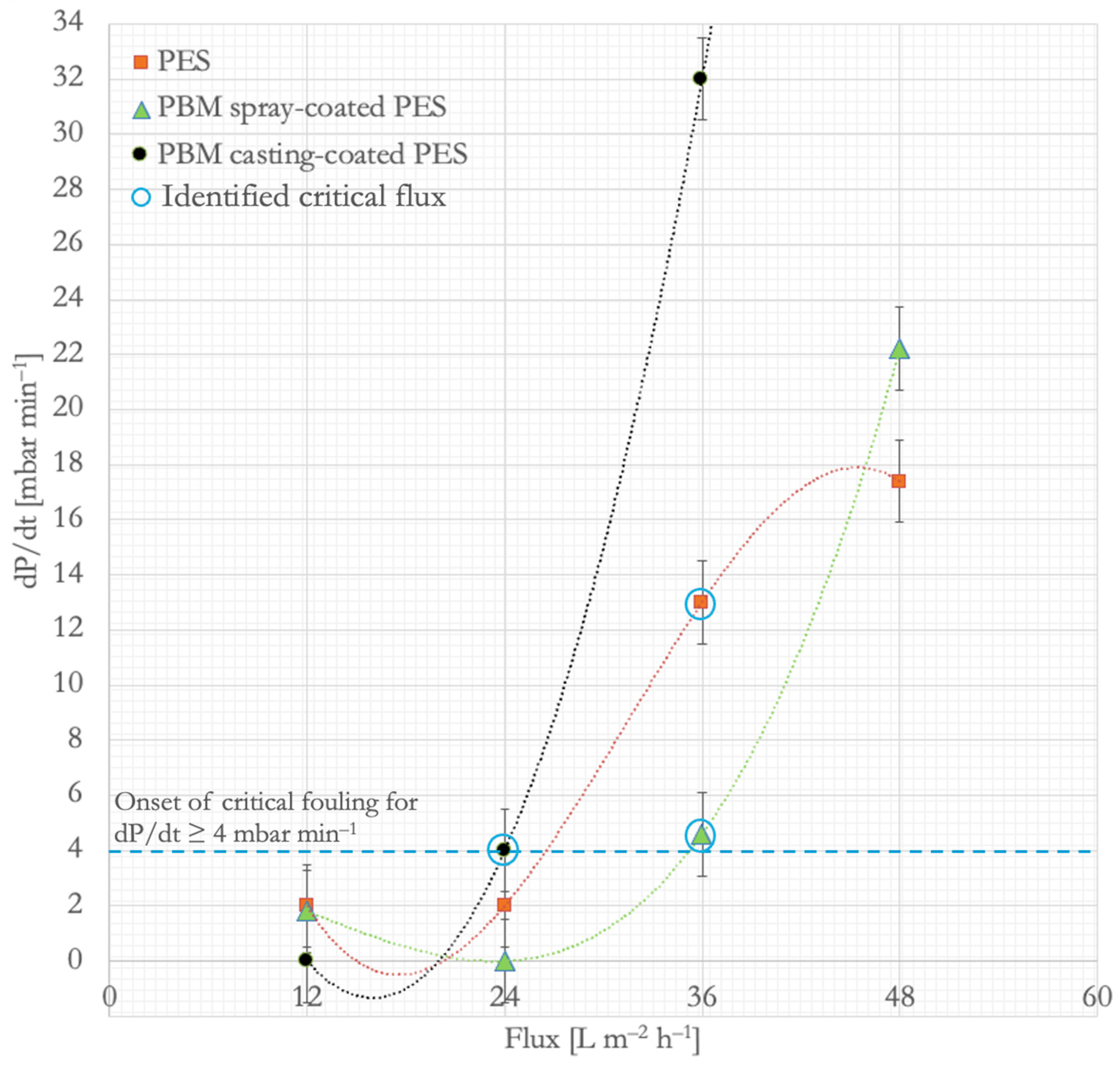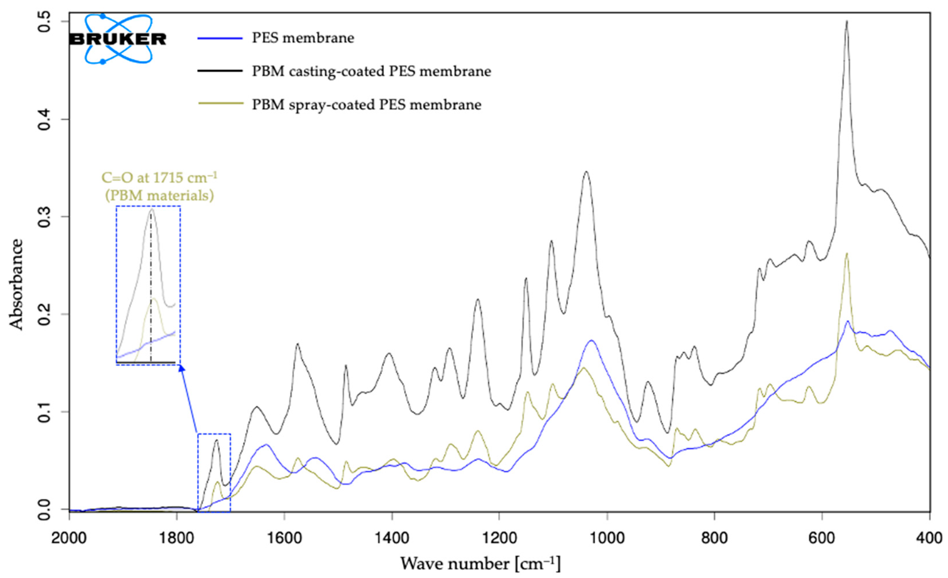 | PES casting-coated with PBM | 2.1 ± 0.6 µm | 1.4 ± 0.2 µm |