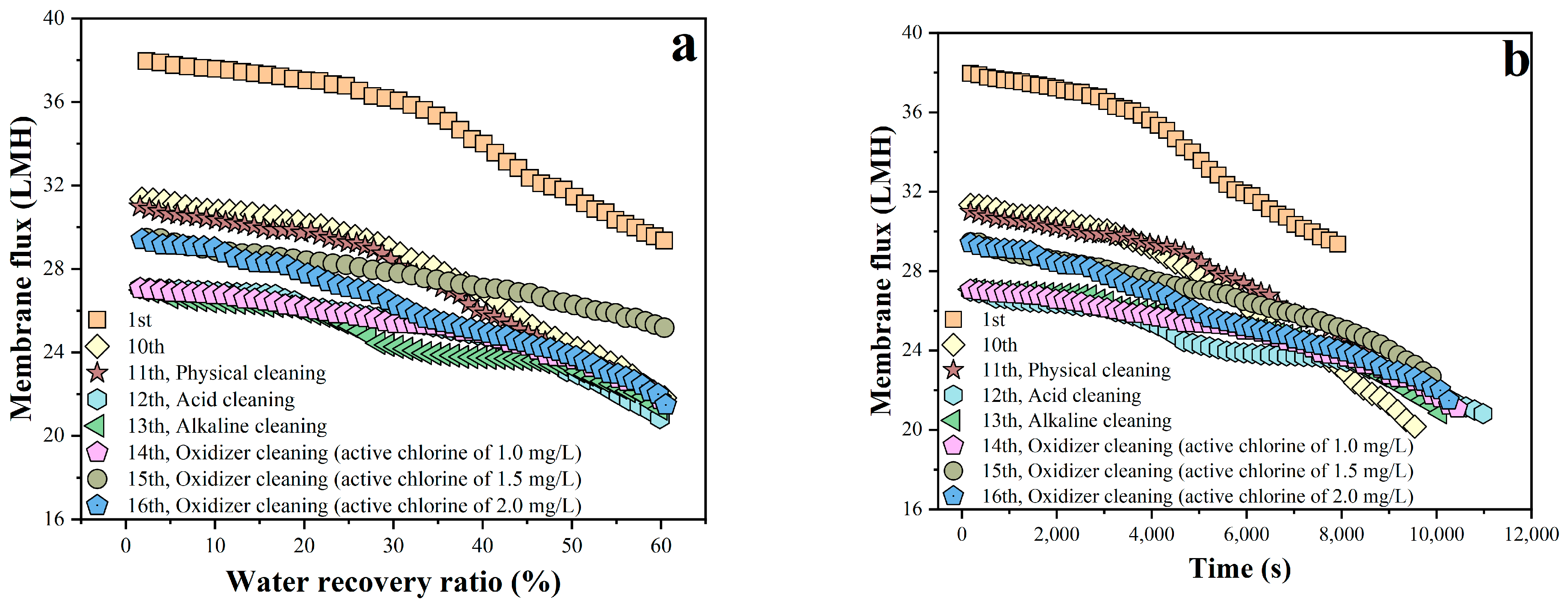 | Cleaning solution | 1% citric acid, pH = 2, 30 ± 2 °C | 2% sodium tripolyphosphate (STPP), 1% EDTA, 0.3% NaOH, 0.02% sodium dodecylbenzenesulfonate (SDBS), pH = 11.5, 35 ± 2 °C | 1% citric acid, pH = 2, 30 ± 2 °C | 2% STPP, 1% EDTA, 0.3% NaOH, 0.02% SDBS, pH = 11.5, 35 ± 2 °C |