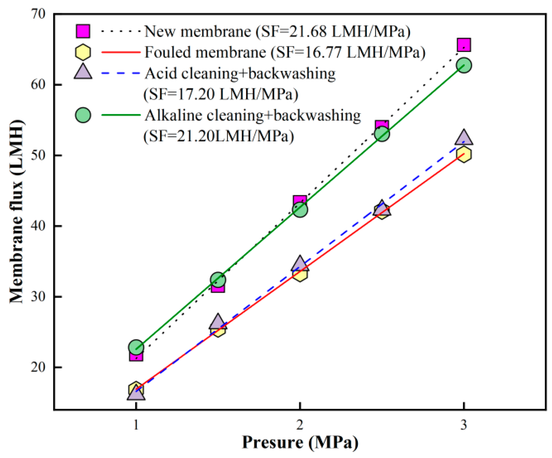 - Demonstration of the Optimal Combined Cleaning Method. Following the above-mentioned investigation, the optimal combined acid → alkaline forward flushing with pure water backwashing was employed for the fouled RO membrane after 6 batches of filtration to demonstrate its cleaning performance.