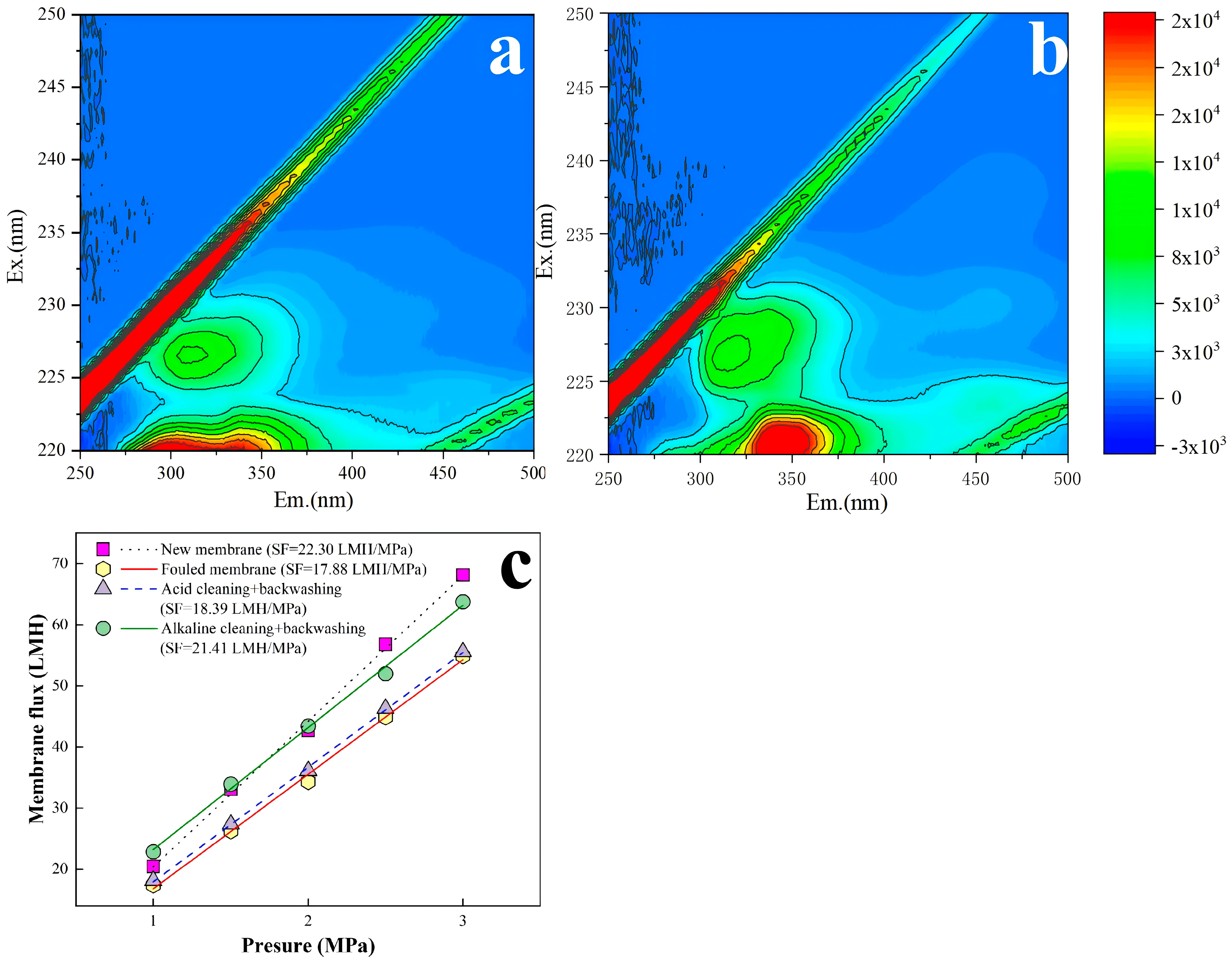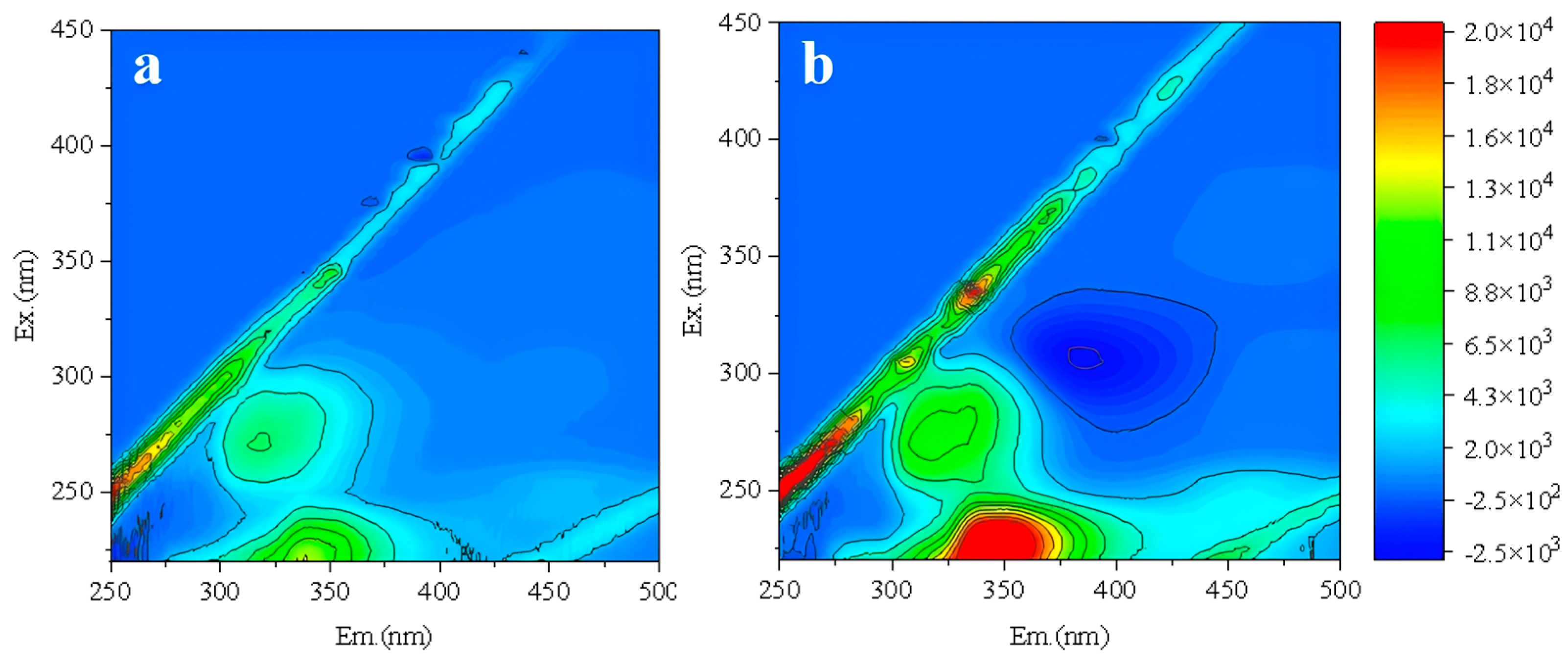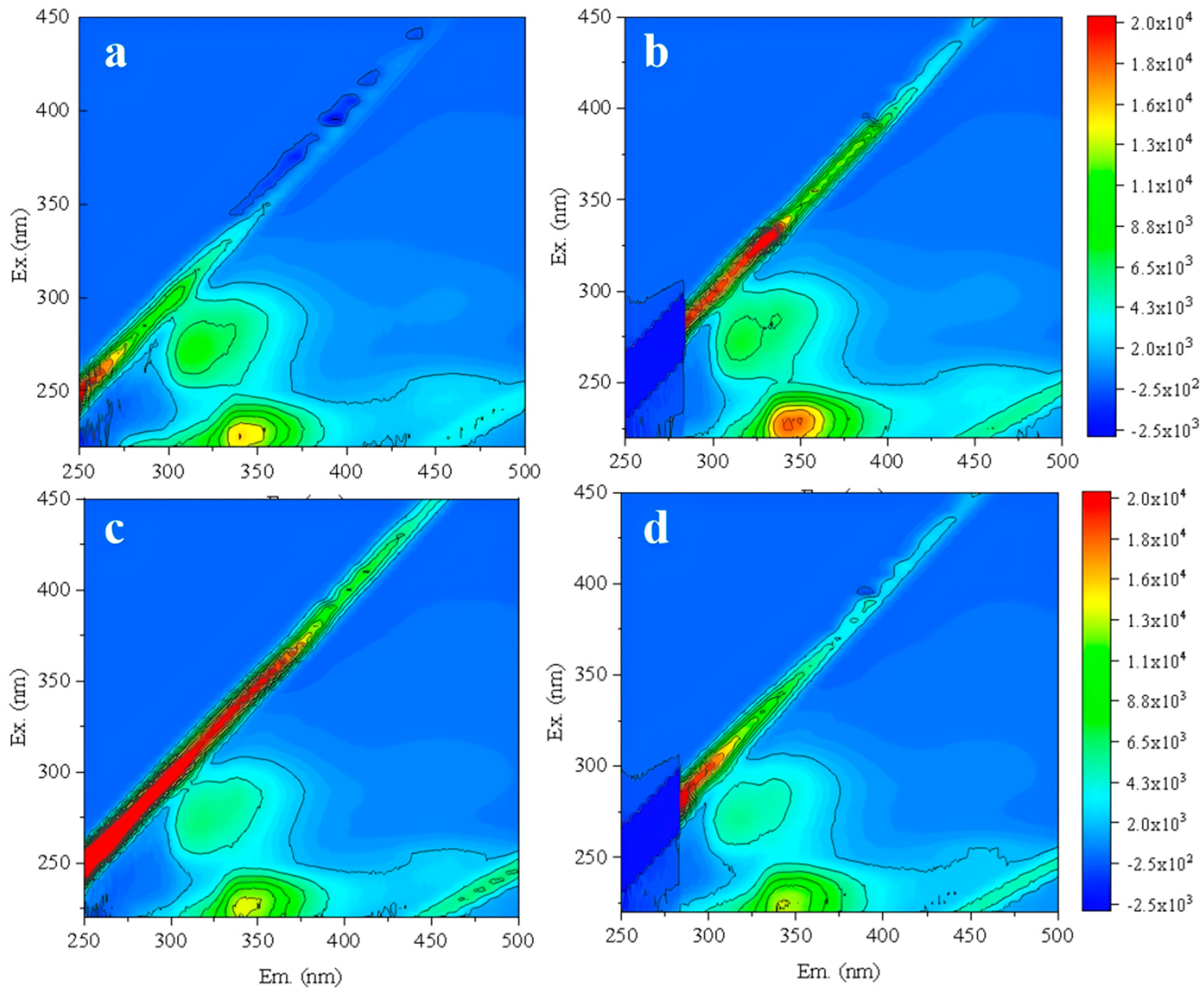 - Jacquin, C.; Lesage, G.; Traber, J.; Pronk, W.; Heran, M. Three-dimensional excitation and emission matrix fluorescence (3DEEM) for quick and pseudo-quantitative determination of protein- and humic-like substances in full-scale membrane bioreactor (MBR). Water Res. 2017, 118, 82–92. [Google Scholar] [CrossRef]