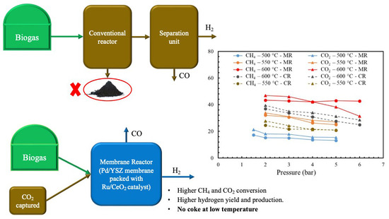 - Nishimura, A.; Takada, T.; Ohata, S.; Kolhe, M.L. Biogas Dry Reforming for Hydrogen through Membrane Reactor Utilizing Negative Pressure. Fuels 2021, 2, 194–209. [Google Scholar] [CrossRef]