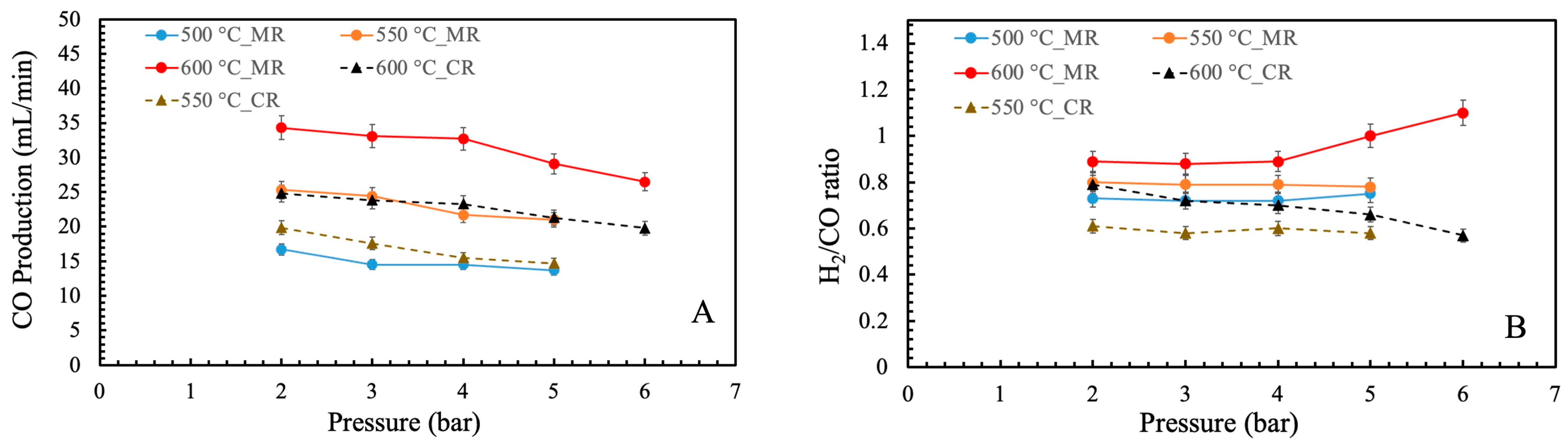 | Pressure | H2 Production (mL/min) | CO Production (mL/min) | H2 Yield (%) | H2/CO Ratio | ||||