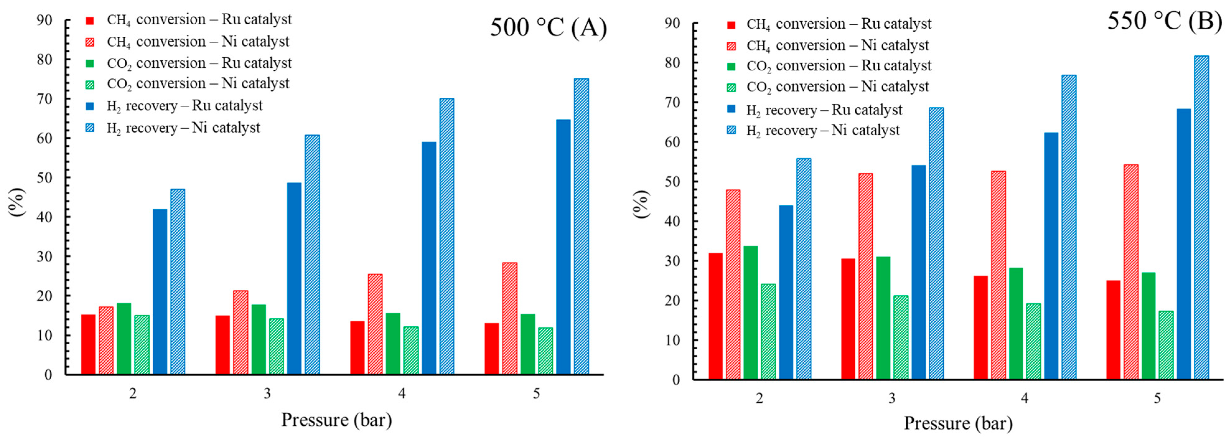 | Membrane | ) | Catalyst | T (°C) | P (Bar) | CH4 Conversion (%) | CO2 Conversion (%) | H2 Recovery (%) | Ref |