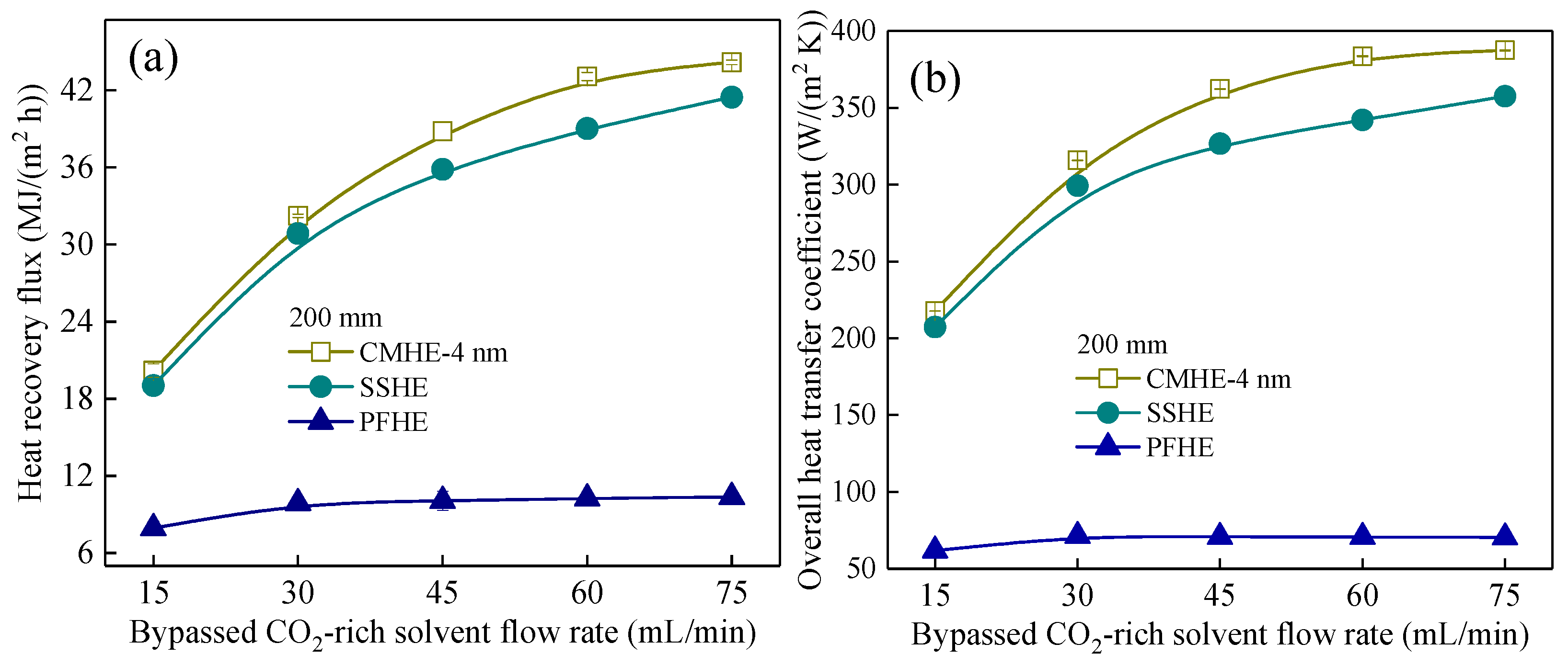 The 4-nm CMHE achieves the highest waste heat recovery flux (q = 38.8 MJ/(m2 h)), outperforming the SSHE and FPHE by approximately 4.3% and 304%, respectively, when the solvent flow rate is 45 mL/min. Its overall heat-transfer coefficient (U = 362 W/(m2 K)) also exceeds that of the SSHE (345 W/(m2 K)) and the FPHE (66 W/(m2 K)). In addition, CMHE can recover high-purity water by 6–12 kg/(m2 h), whereas the other cases can not.