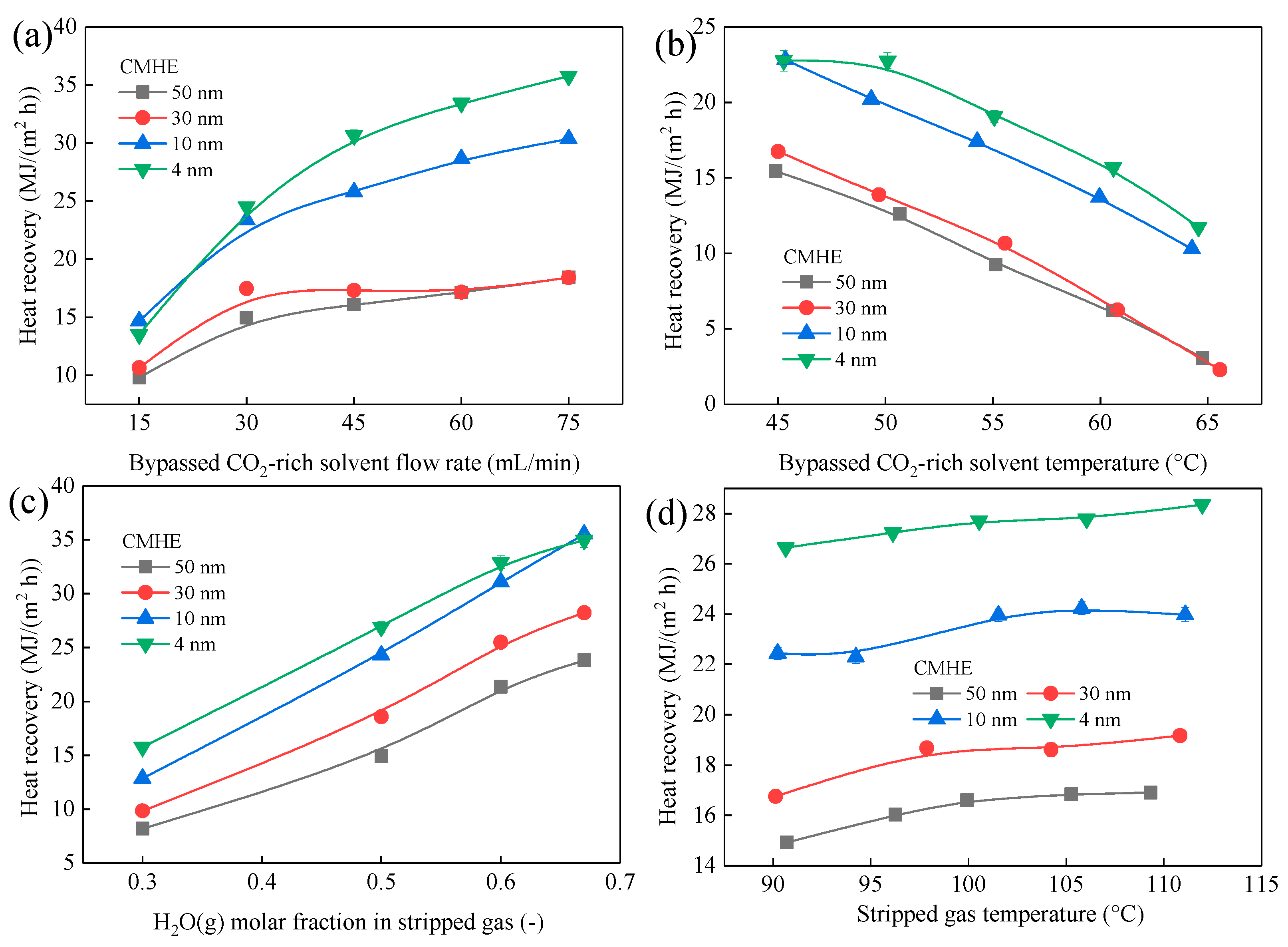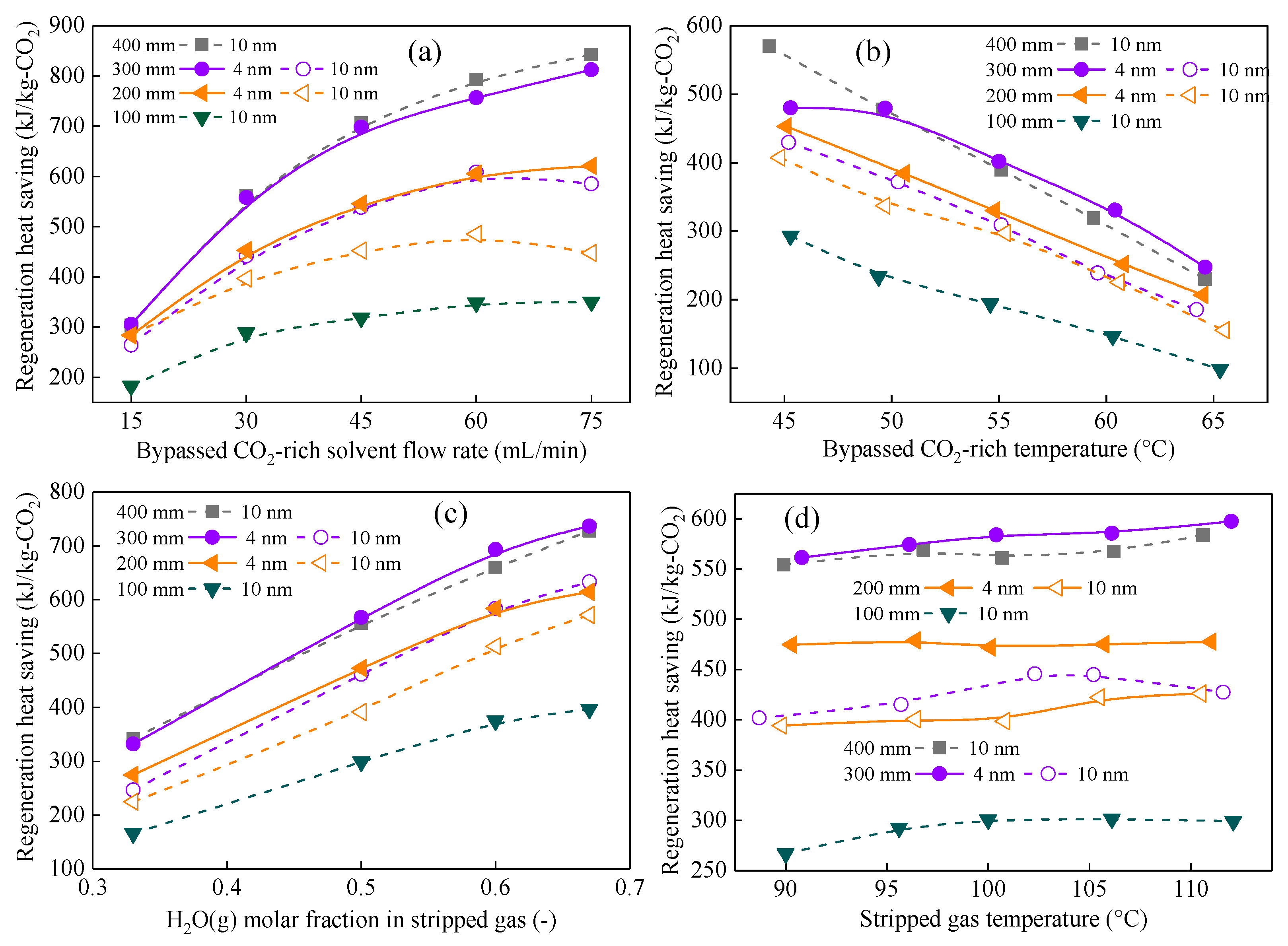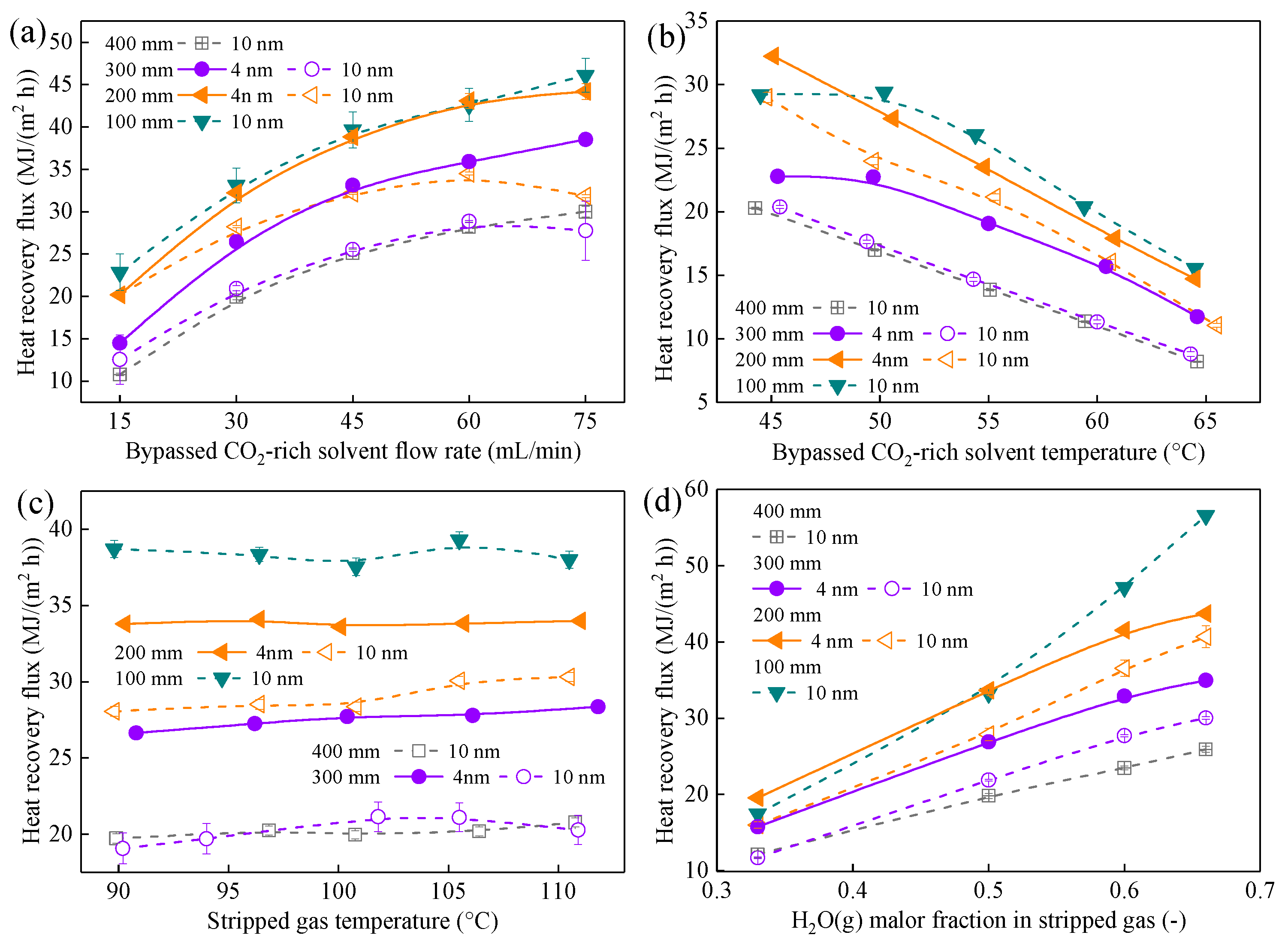 Membrane length is also a key parameter, which fundamentally dictates the residence time of the stripped gas and the driving force of condensation. In this section, the CMHEs with different lengths were adopted to investigate the waste heat recovery performance in terms of heat recovery flux in MJ/(m2 h), total recovered heat in MJ/h, and regeneration energy consumption reduction potential in kJ/kg-CO2 to meet different engineering requirements. Four different types of length, namely 100, 200, 300, and 400 mm (corresponding to membrane areas of 0.0025–0.01 m2), were used in this section.