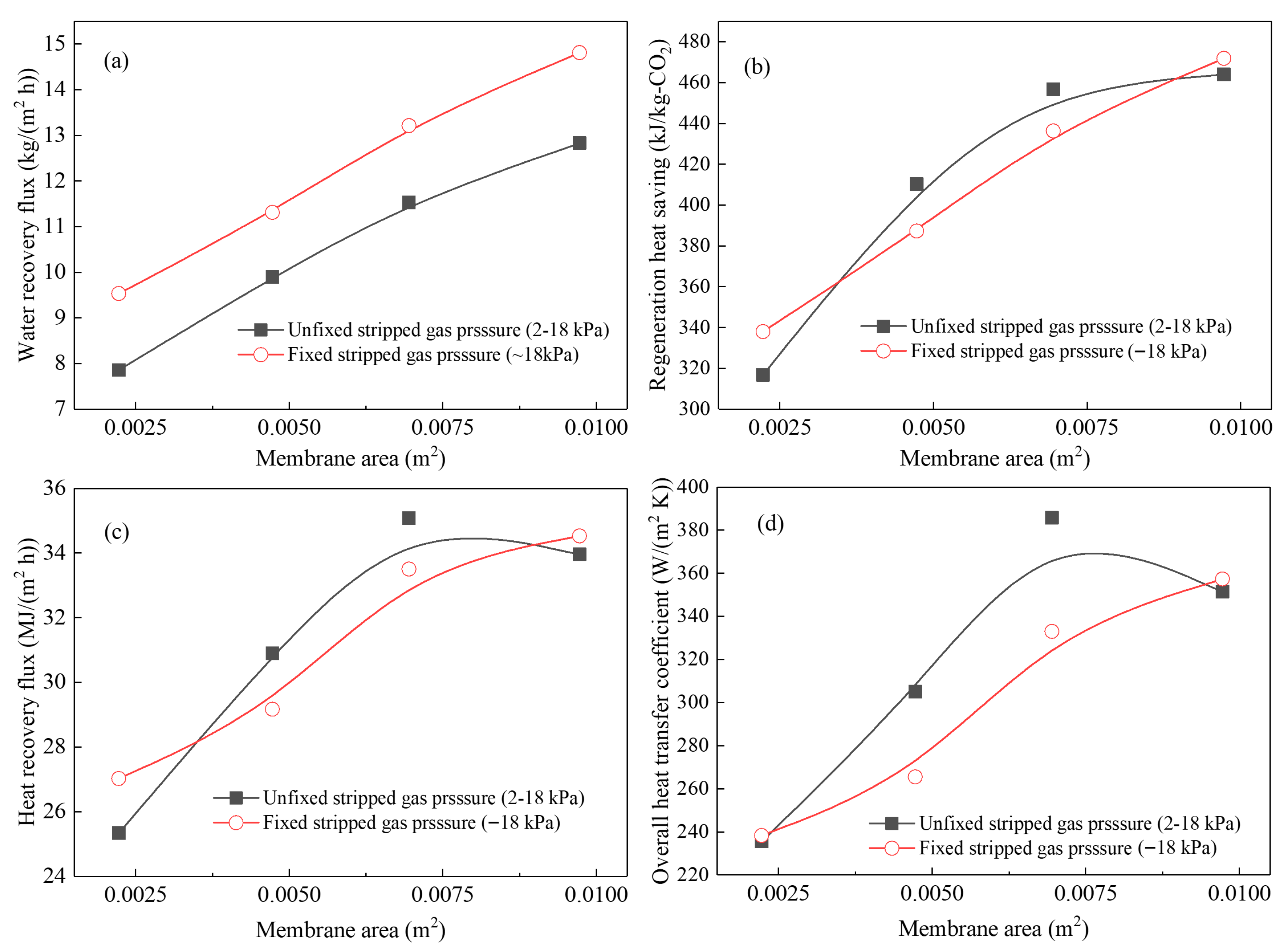 rec, and U values, are higher when the working pressure is fixed, because of the longer resistance time of stripped gas, higher vapor condensate, and heat convection related to water transfer. For example, when the pressure is fixed, and the membrane area is 0.01 m
