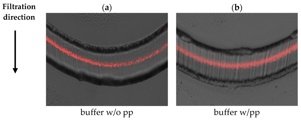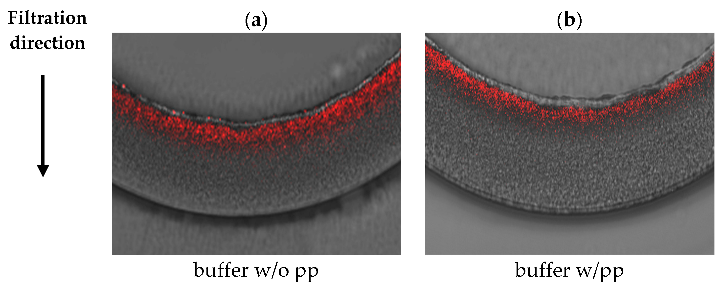 - Dishari, S.K.; Venkiteshwaran, A.; Zydney, A.L. Probing effects of pressure release on virus capture during virus filtration using confocal microscopy. Biotechnol. Bioeng. 2015, 112, 2115–2122. [Google Scholar] [CrossRef]