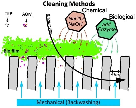 - Rajendran, D.S.; Devi, E.G.; Subikshaa, V.S.; Sethi, P.; Patil, A.; Chakraborty, A.; Venkataraman, S.; Kumar, V.V. Recent Advances in Various Cleaning Strategies to Control Membrane Fouling: A Comprehensive Review. Clean Technol. Environ. Policy 2025, 27, 649–664. [Google Scholar] [CrossRef]