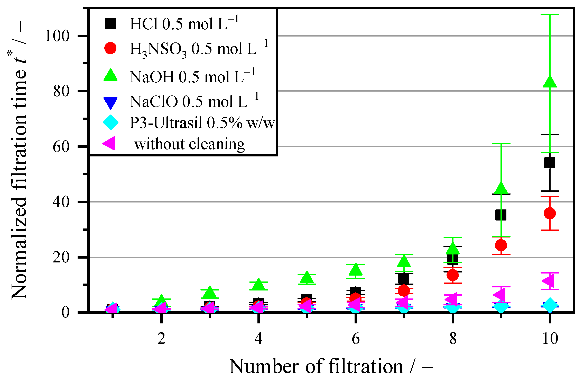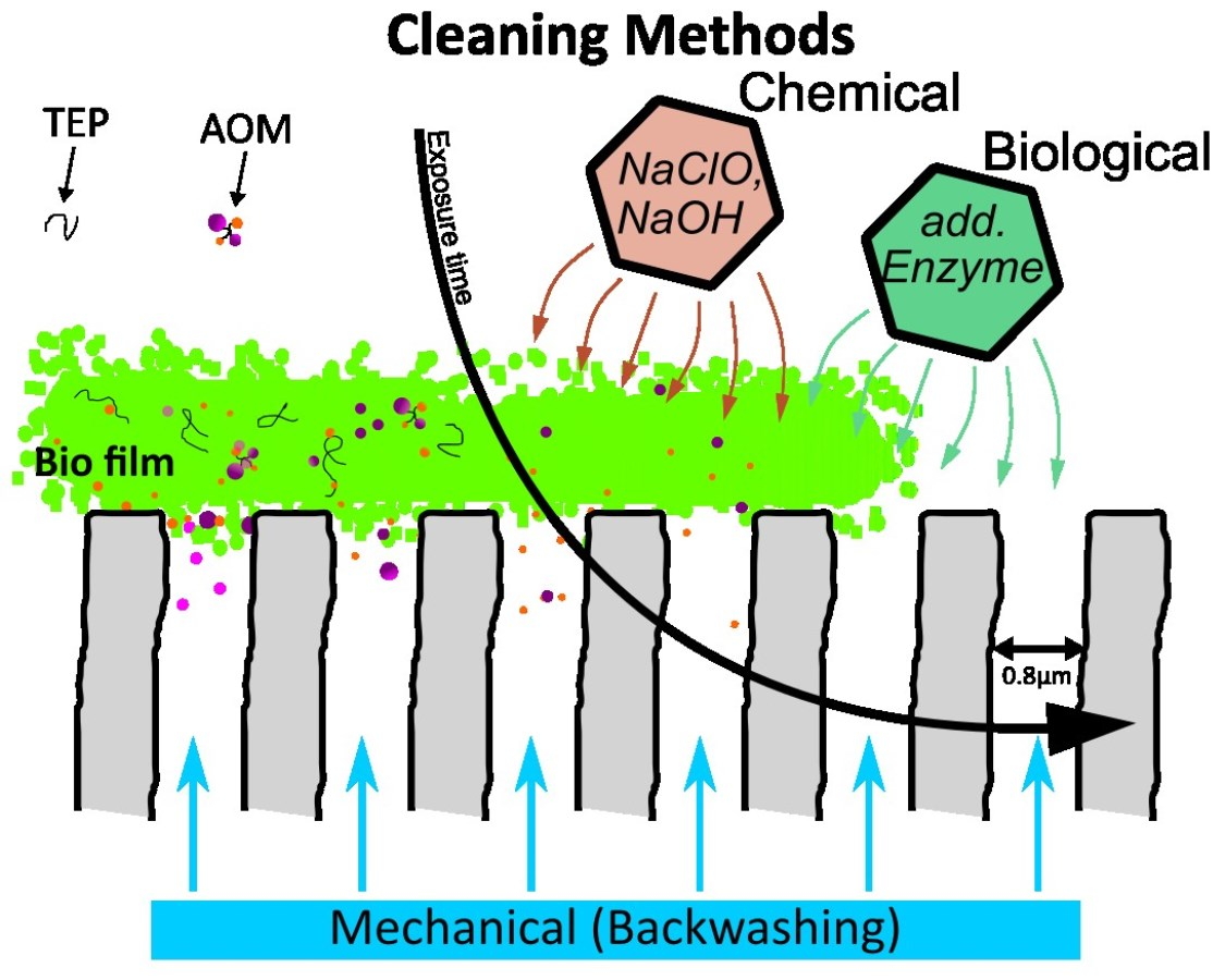 | Cleaning through hydrolysis and surfactants | Both the pure NaClO and the multi-component mixture P3-Ultrasil regenerate the membrane to 5.4 times the throughput compared to that without cleaning. The oxidative effect of NaClO and the dissolving effect of the anionic surfactants in P3-Ultrasil can thus remove the biofilm on the membrane. However, larger cell residues are not removed with these two cleaning agents. |