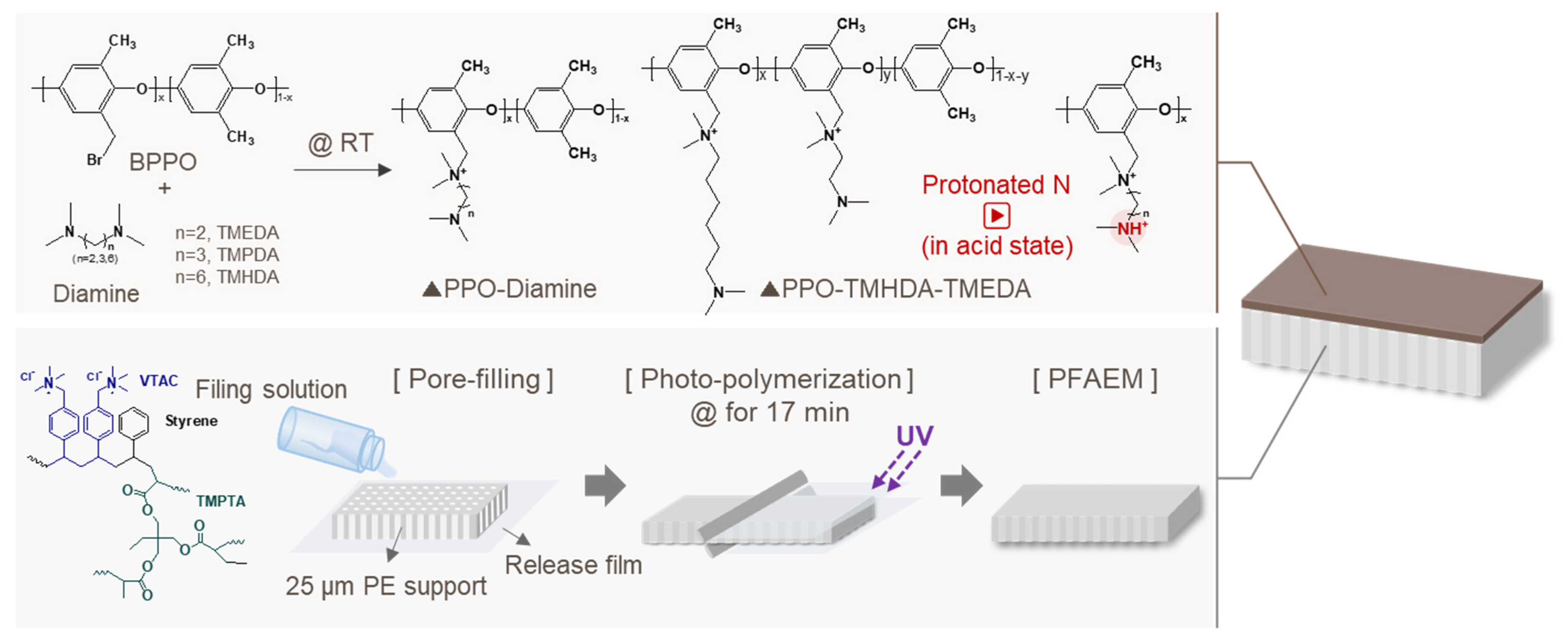 - Jang, S.; Woo, J.-J.; Cha, J.-E.; Choi, Y.-W.; Kim, J. A polymeric structural approach to improving proton-blocking performance in anion exchange membranes for electrochemical systems. Desalination 2024, 586, 117888–117897. [Google Scholar] [CrossRef]