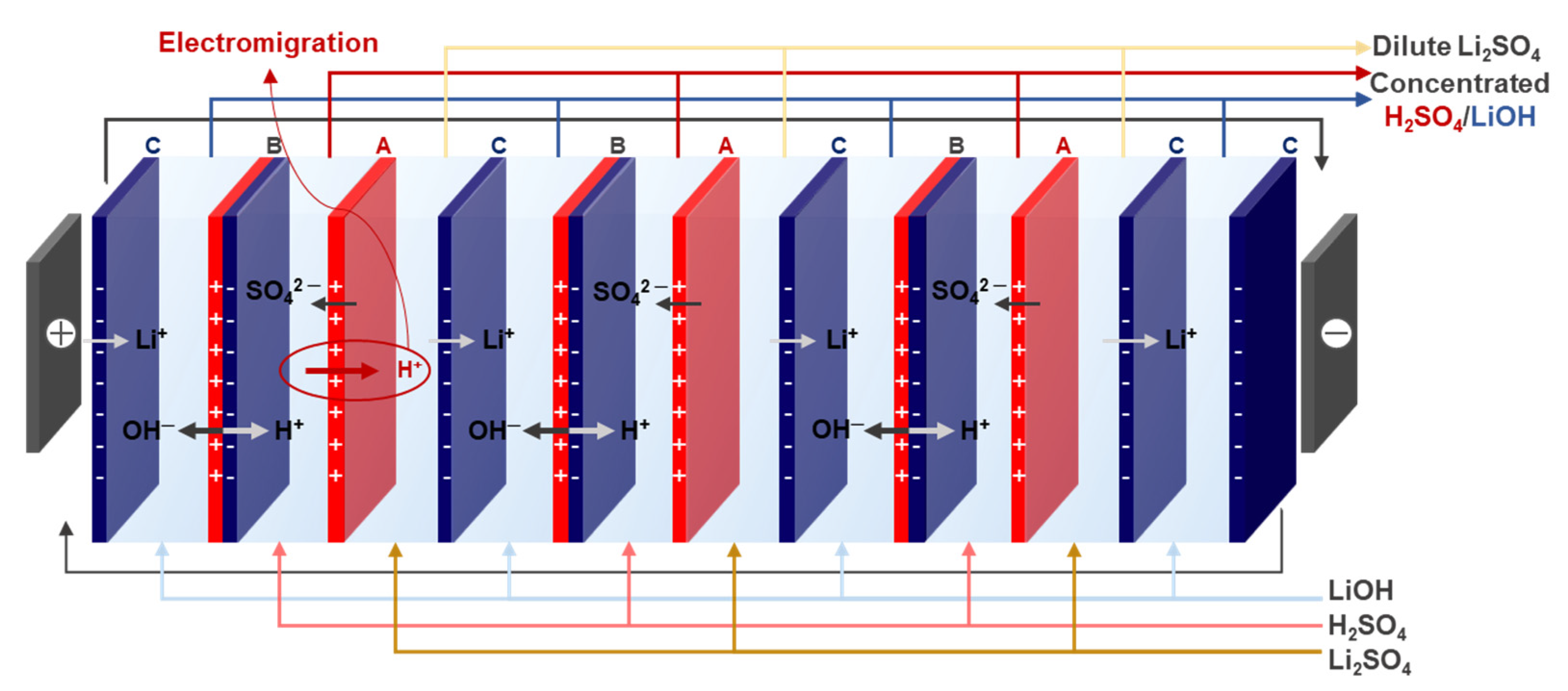 - Chen, X.; Ruan, X.; Kentish, S.E.; Li, G.; Xu, T.; Chen, G.Q. Production of lithium hydroxide by electrodialysis with bipolar membranes. Sep. Purif. Technol. 2021, 274, 119026–119035. [Google Scholar] [CrossRef]