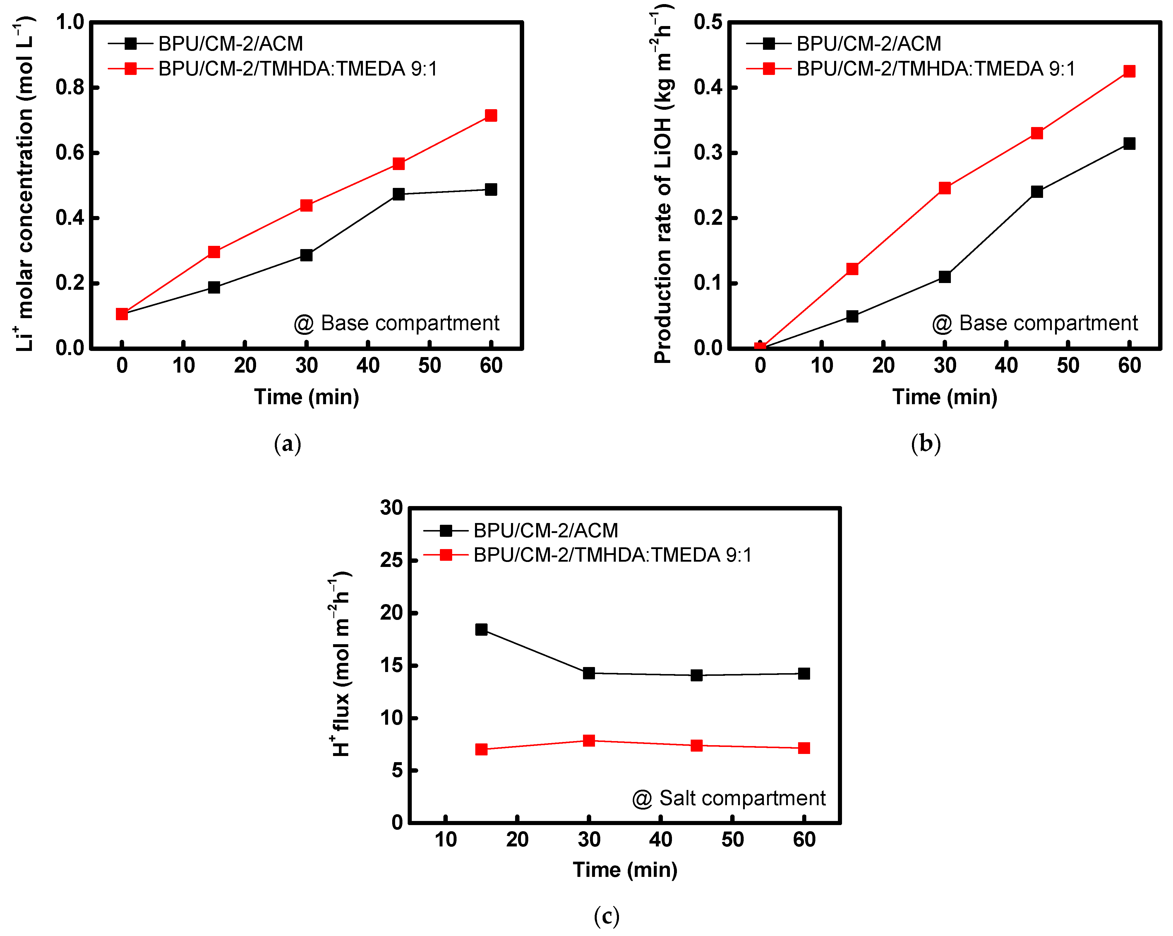 | Membrane | Energy Consumption (kWh kgLiOH−1) | Production Rate (kg m−2h−1) | Recovered Quantity (mmol) |