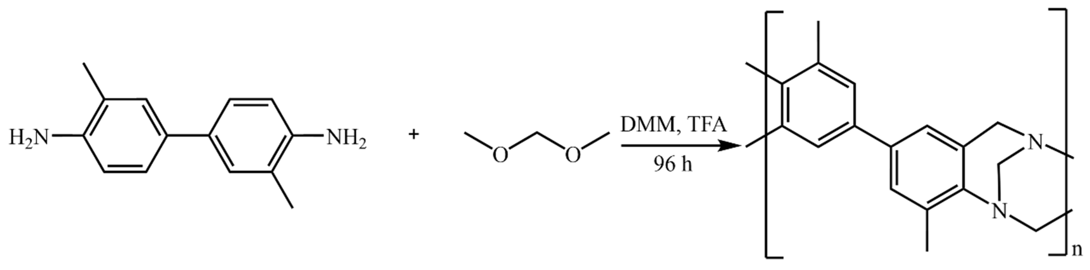 - Carta, M.; Malpass-Evans, R.; Croad, M.; Rogan, Y.; Lee, M.; Rose, I.; McKeown, N.B. The synthesis of microporous polymers using Tröger’s base formation. Polym. Chem. 2014, 5, 5267–5272. [Google Scholar] [CrossRef]