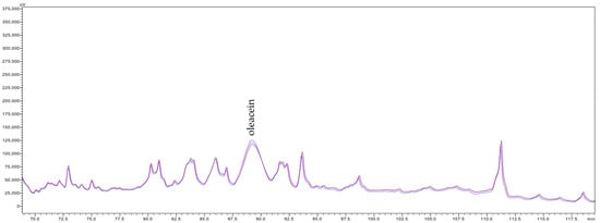 The HPLC analysis indicated that the clarification of olive juice by both studied membranes did not result in the retention of almost all quantified metabolites (Table 7). Only one exception to this trend was observed for 3,4-dihydroxyphenylglycol (3,4-DHPG), for which a retention of 20–23% was recorded following MF500 membrane treatment. However, this compound passed freely, and even its content increased slightly, passing through the tighter MF200 membrane. This behaviour contrasts with prior findings using 800 and 600 nm α-Al2O3 membranes, which showed no retention of 3,4-DHPG, suggesting that this result may represent an experimental anomaly. Conversely, filtration with the MF500 membrane led to notable increases from 3 to 30% of the concentrations of 3,4-DHPE-glucoside isomer 1, tyrosol (4-HPE) and its glucosides, elenolic acid and its glucoside, demethylelenolic acid glucoside (DeMEA-glu) and (E)-comselogoside in the clarified olive juices. Particularly notable were the 27–39% increase in the contents of oleuropein (3,4-DHPE-EA-glu) and oleuropein glucoside isomer 2 (3,4-DHPE-EA-2glu 2), 37–48% in the content of (E)-cafselogoside, 45% increase in the content of (E)-chlorogenic acid ((E)-3-CQA), 65–69% increase in the content of 3,4-DHPE-EA-2glu isomer 1, 52–68% increase in the content of hydroxytyrosol (3,4-DHPE), 73 and 53% increase in the content of (E)-caffeic acid ((E)-3,4-DHCA) and 271–243 and 345–259% increase in the contents of verbascoside and oleacein (3,4-DHPE-DeCMEADA), respectively. Regarding the MF200 membrane, moderate increases (ranging from 2 to 45%) were observed for several compounds, including 3,4-DHPG, 3,4-DHPE and its glucosides, dihydroelenolic acid glucoside (DHyEA-glu), tyrosol (4-HPE), DeMEA-glu, EA and its glucoside, (E)-verbascoside ((E)-3,4-DHCA-(glu-rha)-3,4-DHPE), and (E)-comselogoside (4-HCA-6’-O-glu-EA). Importantly, the increase in concentrations of these compounds in the permeate was observed consistently throughout the filtration process, suggesting the phenomena responsible for these increases was sustained from the onset to the end of filtration. Figure 3 presents chromatograms acquired at 240 nm showing the peak of oleacein in clarified olive juice samples collected at the beginning, middle, and end of the filtration.