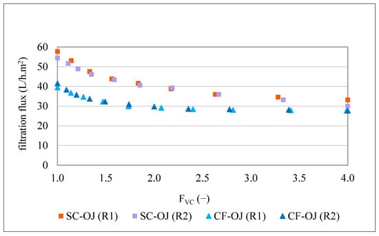 For better understanding of the contribution of the olive juice insoluble (suspended) particles to membrane fouling, two replicates of a semi-clarified olive juice (the 800 nm membrane permeates from the previous study [1]) were filtered by the MF500 membrane, under the same conditions of filtration (1.2 bar, 25 °C and FVC of 4). This semi-clarified olive juice (SC-OJ) had a TDS content of 6.2 g/100 mL, turbidity of 50–30 NTU and particle size distribution within the interval of 0.32–14.2 µm. The kinetics of the filtration fluxes of these treatments are presented in Figure 5. For easier comparison, the kinetics of the MF500 filtration fluxes of the two replicates of centrifuged olive juice (CF-OJ) (Figure 1) are included and all of them are presented as a function of the FVC.