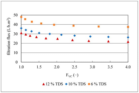 To better understand the impact of TDS on membrane fouling, filtrations of 20 L of olive juice with three different TDS contents (12.4, 10.0 and 6.4 g/100 mL), but with turbidities of 3900–4200 NTU were conducted with the MF500 membrane at 1.2 bar, 25 °C and FVC of 4. The kinetics of the obtained filtration fluxes are presented in Figure 7.