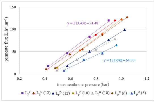 The results revealed a very high logarithmic correlation (R2 = 0.9996) (Figure 8), indicating that the 2-fold decrease in TDS content (from 12 to 6 g/100 mL) resulted in only a 1.3-fold increase in viscosity (from 0.0012 to 0.00152 Pa/s). This suggests that the remaining contribution to the viscosity increase is attributable to other factors, likely related to the total resistance to the filtration flux, as previously reported [52]. In addition, hydraulic permeability tests of the MF500 membrane before each filtration and after each chemical cleaning and membrane drying were also carried out. The results of the tests are presented in Figure 9.