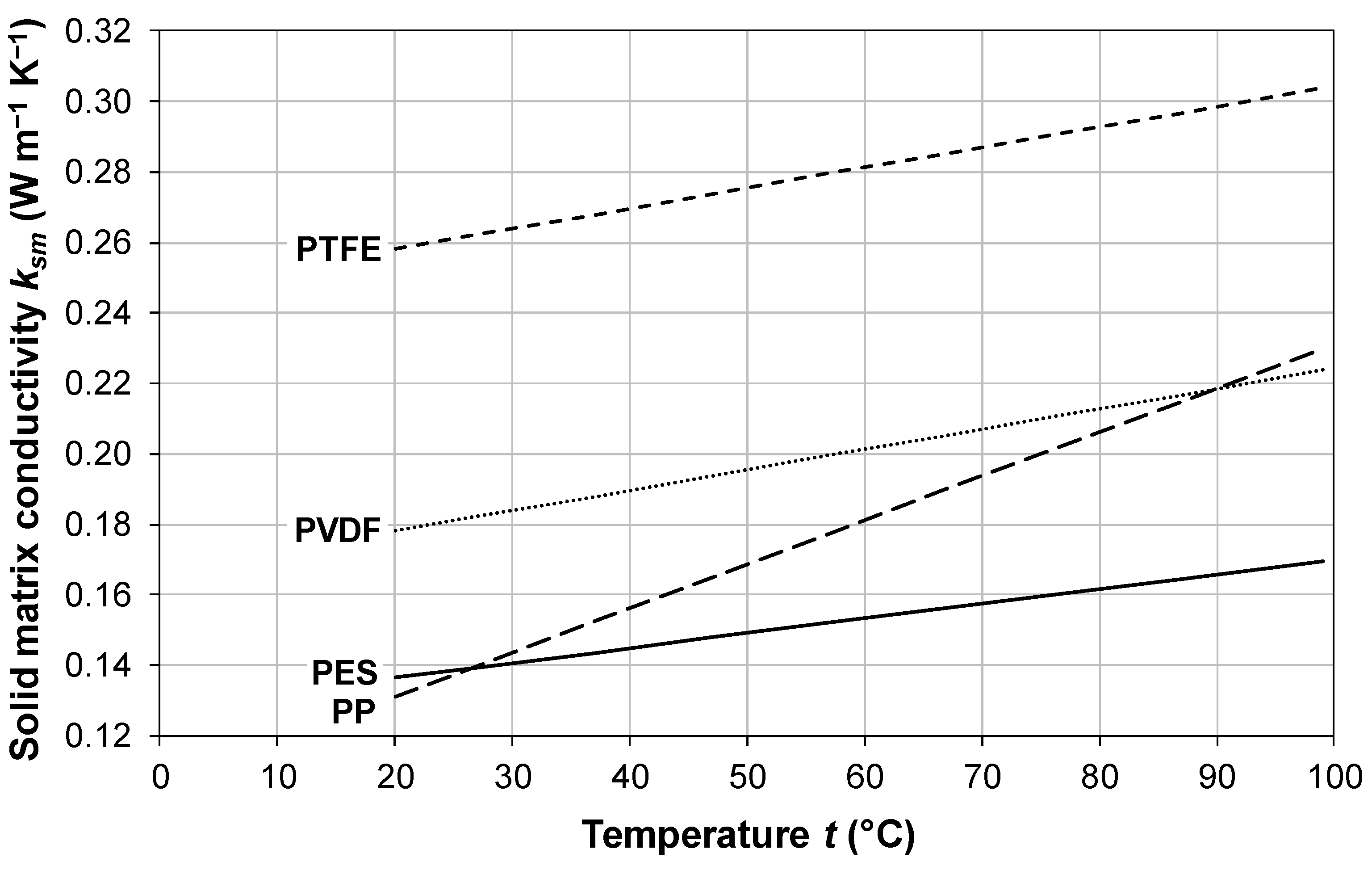 - Predicting the membrane thermal conductivity as a function of porosity and of the conductivities of the polymeric matrix and the filling gas (Equations (31)–(34));