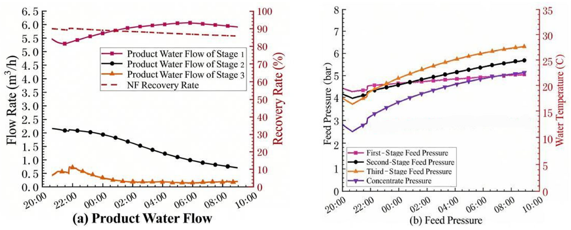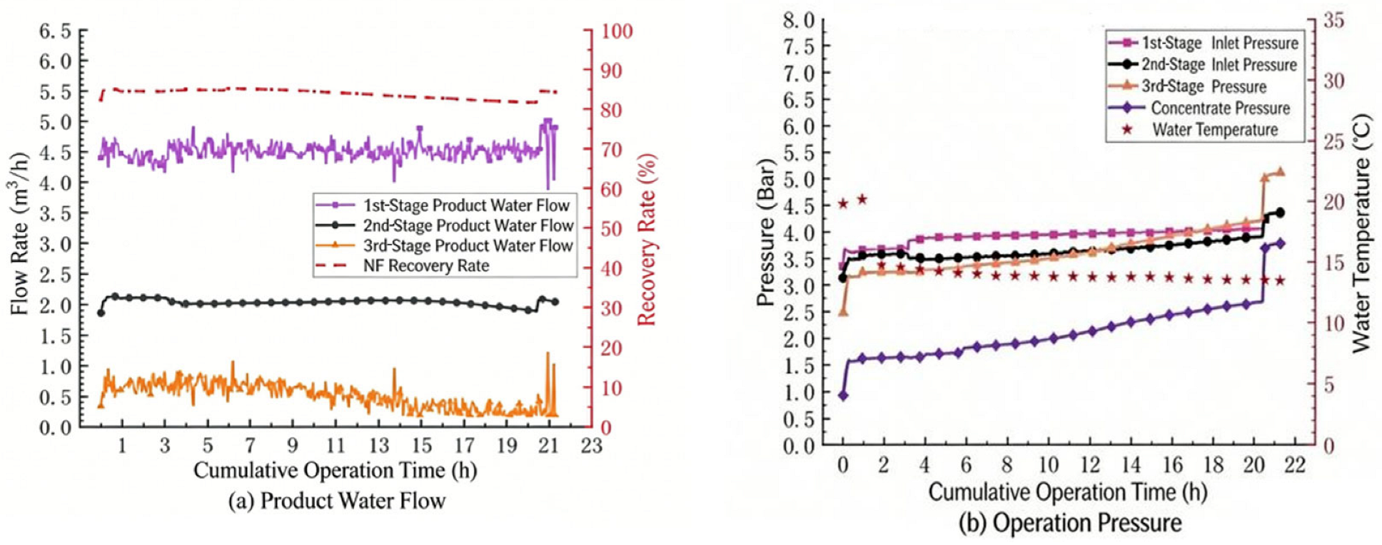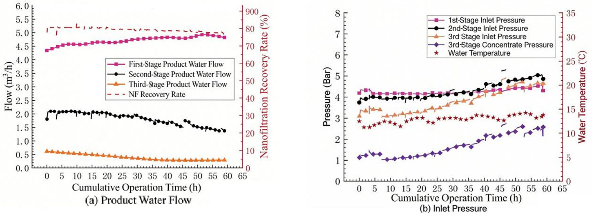 Figure 2b, the operating pressure also showed an upward trend, and then the product water flow rate of the second section also began to decrease. This indicates that under high recovery rate, membrane fouling occurred in the third section of the NF system shortly after operation. With the extension of operation time, the fouling degree of the NF membrane elements in the second section gradually increased, and the product water flow rate began to decrease. At the same time, the pressure increase caused by membrane fouling in the third section was also transmitted to the second and first sections, resulting in a continuous increase in the influent pressure of the system.