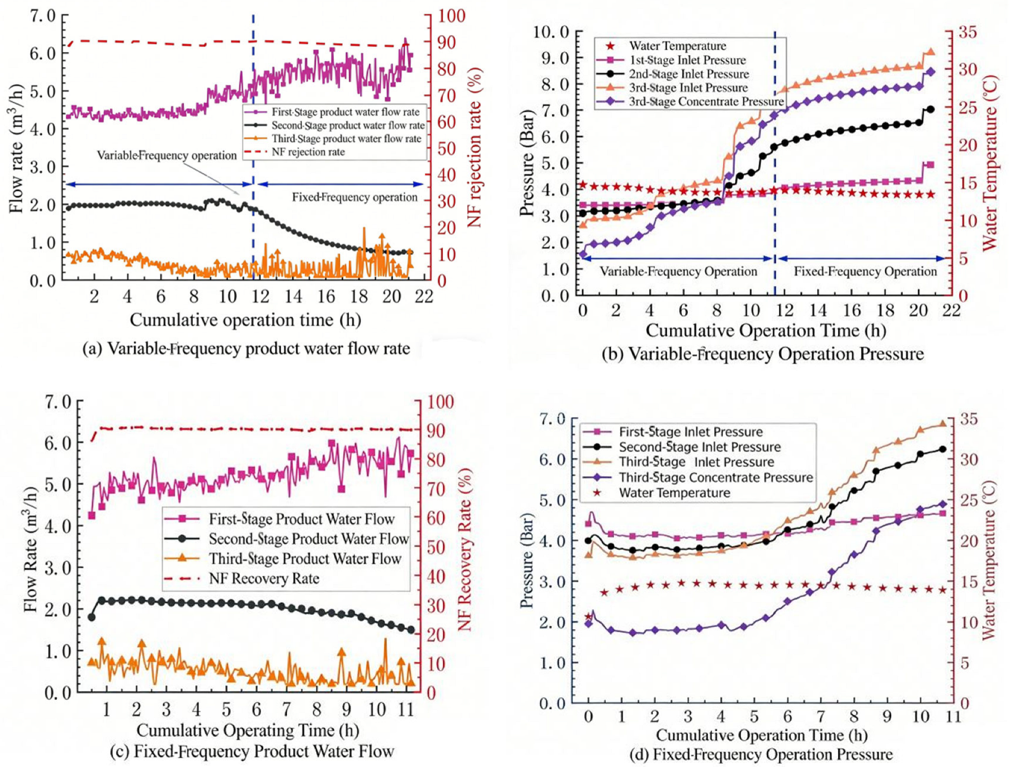 3/h, with a decrease of more than 30%. The product water flow rate of the second section also began to decrease after 6 h. Increasing the frequency of the booster pumps in the second and third sections (frequency conversion) to increase the pressure on the influent side of the membrane did not significantly increase the product water flow rate of the third section. In the later stage, an attempt was made to repeat the test under the condition of controlling the frequency of each water supply pump to be constant (fixed frequency), as shown in