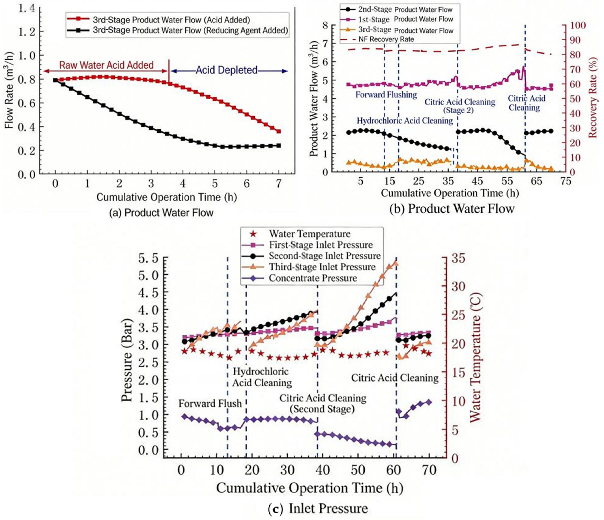 Figure 8b,c respectively. It can be seen that when acid is added before the influent of the third stage, the water production volume in the third stage of the nanofiltration system begins to decline significantly. After cleaning with citric acid and repeating the experiment, the same situation still occurs. The content of aluminum ions in the cleaning solution was relatively high (5.3 mg/L), suggesting that aluminum precipitation played a key role in the observed fouling.