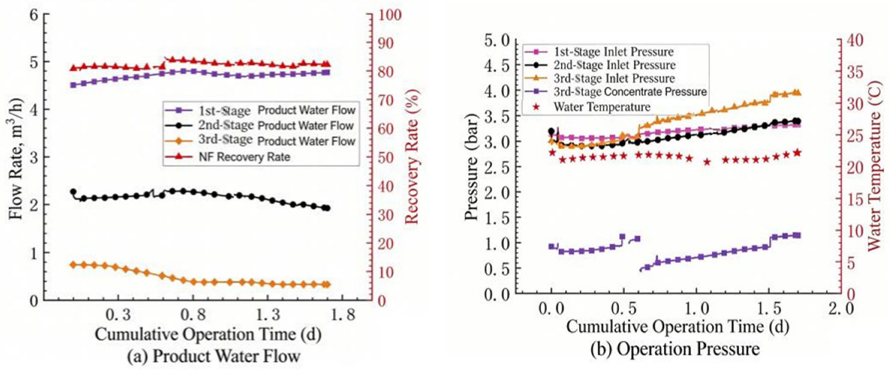 3.1. Operational Stability of Nanofiltration System Under High Recovery Rate
