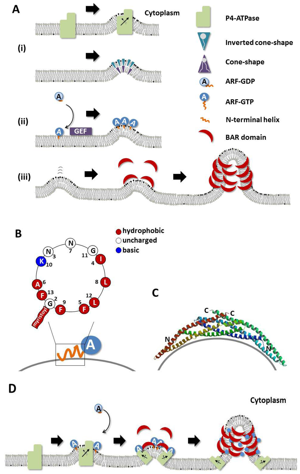 Mechanistic model for the generation of membrane curvature. (A) Membrane deforming mechanism (i) Lipid composition is changed by P4-ATPases, LPAT and PLA2; (ii) amphipathic helices of Arf family small GTPases are inserted into the cytoplasmic leaflet of the membrane; and (iii) the resultant curvature is sensed and stabilized by BAR domain proteins; (B) Helical-wheel representation of the N-terminal amphipathic helix of Arf1 (amino acids 2-13); (C) Structure of the BAR domain dimer of arfaptin. Image from the RCSB PDB [] of PDB ID 1I49 []; (D) The complex regulation of proteins involved in generating membrane curvature.