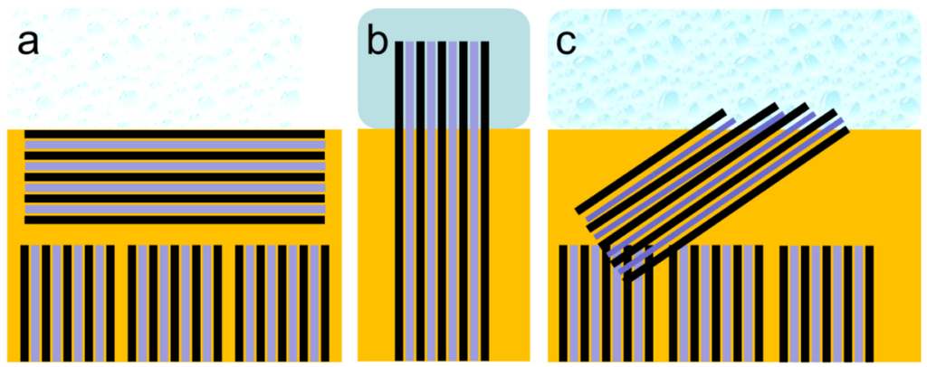 The structure of the interface is critically important for the conductivity of a fuel cell because it connects the membrane to the electrodes. The interface structure depends on the surface energy of the membrane and the contact material. The interfacial area of Nafion®, the fraction of hydrophilic surface, and thereby the total interfacial energy are closely related to its nanostructure [5]. The interface structure of Nafion® in contact with liquid water and water vapor has been investigated in detail by Bass et al. with respect to the orientation of the assumed hydrophilic water-filled polymer fibrils [5,6]. The polymer strands are assumed to be present as bundles aligned parallel to a solid/gas interface or tend to be perpendicular at the liquid-water interface. The parallel-aligned hydrophilic channels in a lamellar structure do not allow easy water penetration into the membrane. In contrast, at the membrane/liquid-water interface, these bundles are reported to reorientate in the direction perpendicular to the membrane surface, at which point water can enter the widened and open hydrophilic conductive channels. Based on contact-angle measurements taken at different interfaces, the fraction of hydrophilic surface area has been calculated to change from 0.05 in the dry polymer to greater than 0.11 in water vapor and up to 0.95 in liquid water [5,6]. A scheme of this interface interaction is given in Figure 1.