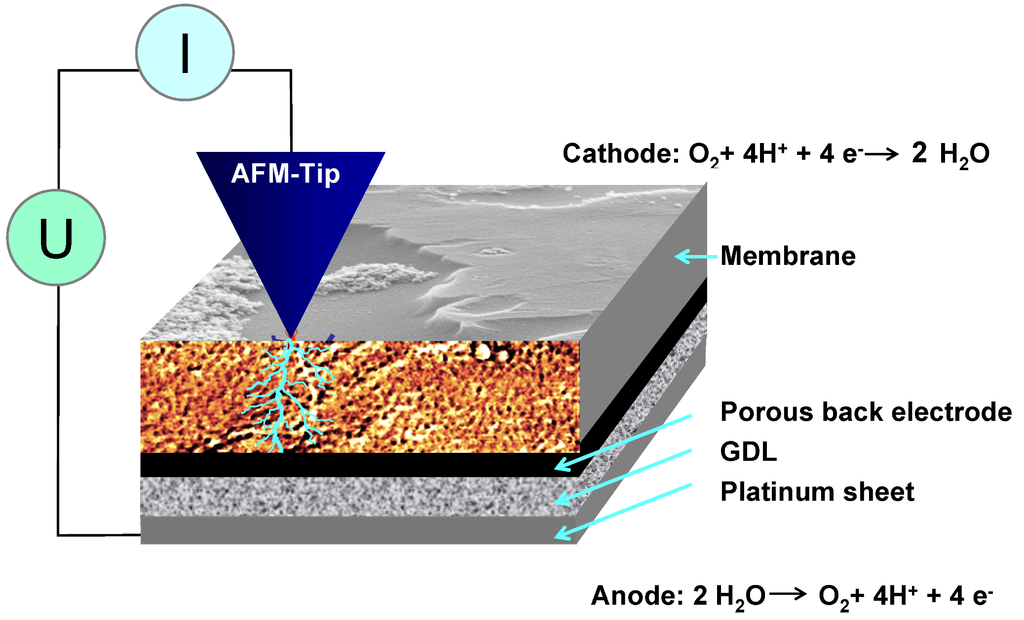 As solid-electrolyte membranes, protonated Nafion®, mostly of type 112, was used. For current measurements, the back side of fully protonated membranes was coated with an extended porous electrode that contained platinum. Some samples were single-side coated with a porous PT/C/Nafion® electrode via dry hot spraying at DLR. The membranes were stored for at least one week in ultra-pure H2O with H2SO4 added to prevent bio-deterioration. The measurements were performed in a humid environment in ambient air using an applied voltage greater than 1.3 V. The current flow is based on two electrochemical reactions: Mainly oxygen evolution from water splitting at the back electrode and oxygen reduction with the formation of water at the platinum-coated AFM tip, which is used as a nano-electrode at the otherwise bare membrane surface. It cannot be excluded that hydrogen evolution may take place in a low rate at the tip but this is not expected to alter the current mapping as confirmed by changing bias voltage. A scheme of the setup is given in Figure 2. For AFM analysis, the electrode-coated samples were bonded to Toray paper using a liquid Nafion®/graphite mixture that contained 0.5 mg/cm2 of platinum. Unless otherwise stated, the samples were activated in an electrolysis arrangement between a platinum sheet and a platinum grid as electrodes for at least 1.5 h at a voltage of 2.7 V in water. For AFM measurements, the complete sample was placed on a platinum sheet, and the surface was dried with a tissue to remove excess water. The bias was applied to the cell such that hydrogen evolution takes place at the side with the carbon components; thereby carbon corrosion is avoided.