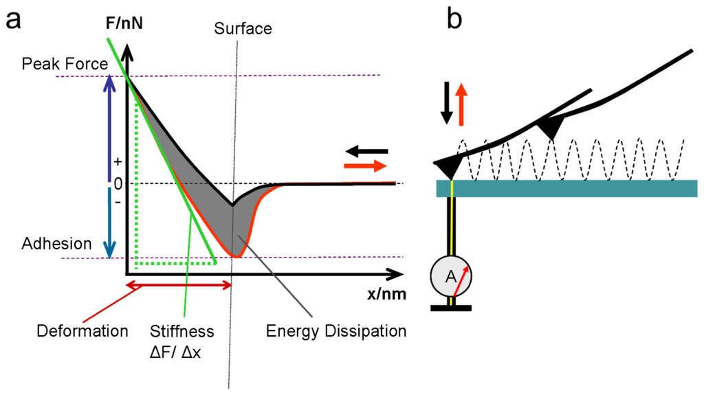 (a) Evaluation of mechanical properties from the force-separation curve; (b) The force-separation curve and evaluation of mechanical properties at every image point. Current measurement with a conductive AFM tip is also possible during contact.