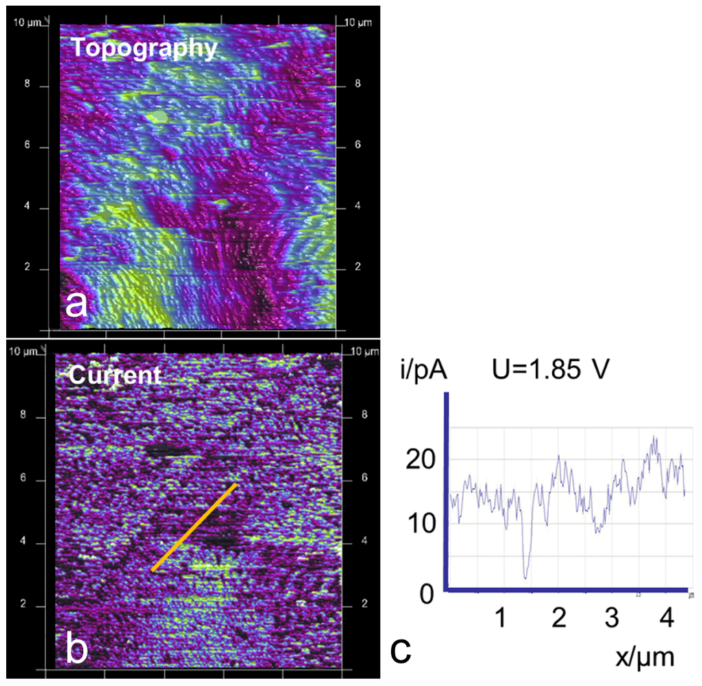 At a protonated and water-soaked but not activated Nafion® sample, the conductivity measured by conductive AFM is barely detectable. The common activation procedure is to force a flow of current by, e.g., electrolysis. Without activation, even after more than one week of storage in water, only a current of a few pA could be detected in all cases (Figure 4). The often-observed lamellar structure in the topography, which is also visible in the conductivity images (Figure 4), supports a parallel orientation of polymer structures with respect to the surface, as has been reported by other researchers [5,6,28]. A voltage of U = 1.85 V was used because of the relatively low current response of the membrane.