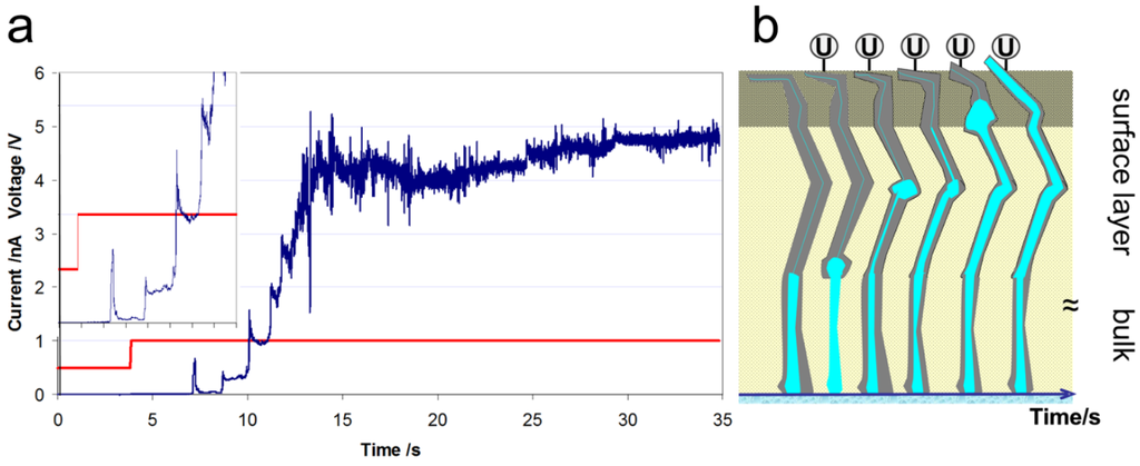 We interpret the activation process and the AFM observations in the context depicted in Figure 5b. The application of a voltage between the AFM tip and the extended back electrode leads to a proton current, which is accompanied by water flow due to the electro-osmotic drag. The water flow is most likely hindered by a surface layer with limited conductivity, and the water flow driven by the current leads to an increase in water pressure at a bottleneck in the conductive network. However, a change in connectivity of the conductive network in the bulk of the membrane, which has been reported to be dependent on water activity, may also occur [3]. At a certain water pressure, the inner pressure of the polymer is overcome, and a widening of the water channel occurs, which leads to a sudden current increase. The subsequent release of static water pressure associated with water flow is followed by elastic release of the polymer and shrinkage of the channel. Because of the irreversible plastic deformation of the polymer, a permanent widening of this conductive channel occurs and results in a higher steady-state current. This cycle was repeated with decreasing time intervals, and smaller current changes (i.e., smaller built-up pressures) were observed until a final current level was reached. This activation is assumed to lead to a preferentially orientated conductive network in the surface layer. The structure induced by current flow with an applied voltage results in a water-filled channel that is sufficiently large to fulfill the hydrodynamic water flow requirements. Bulk water properties are also associated with high proton conductivity according to the Grotthuss mechanism [30]. The energy input by the applied voltage and the forced current flow obviously accelerates the reconstruction, at least at the surface layer, compared to the change observed for equilibrium conditions at a liquid water interface. In a fuel cell, an activation time is also observed, and optimum performance is typically reached only after some hours of operation, which may be caused, in part, by the necessity of a similar membrane activation process. This process obviously occurs at start-up of a fuel cell after the application of voltage and current flow.