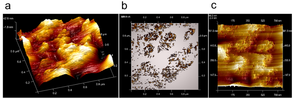 The surface topography of Nafion® 112, imaged by TUNA-mode tapping AFM where the Nafion is fully humidified and under current flow, is shown in Figure 6a. The maximum height difference was approximately 60 nm on the image length of one micrometer. Several protrusions are visible with a size of approximately 200 nm; the protrusions are composed of smaller features with a diameter of approximately 50 nm.