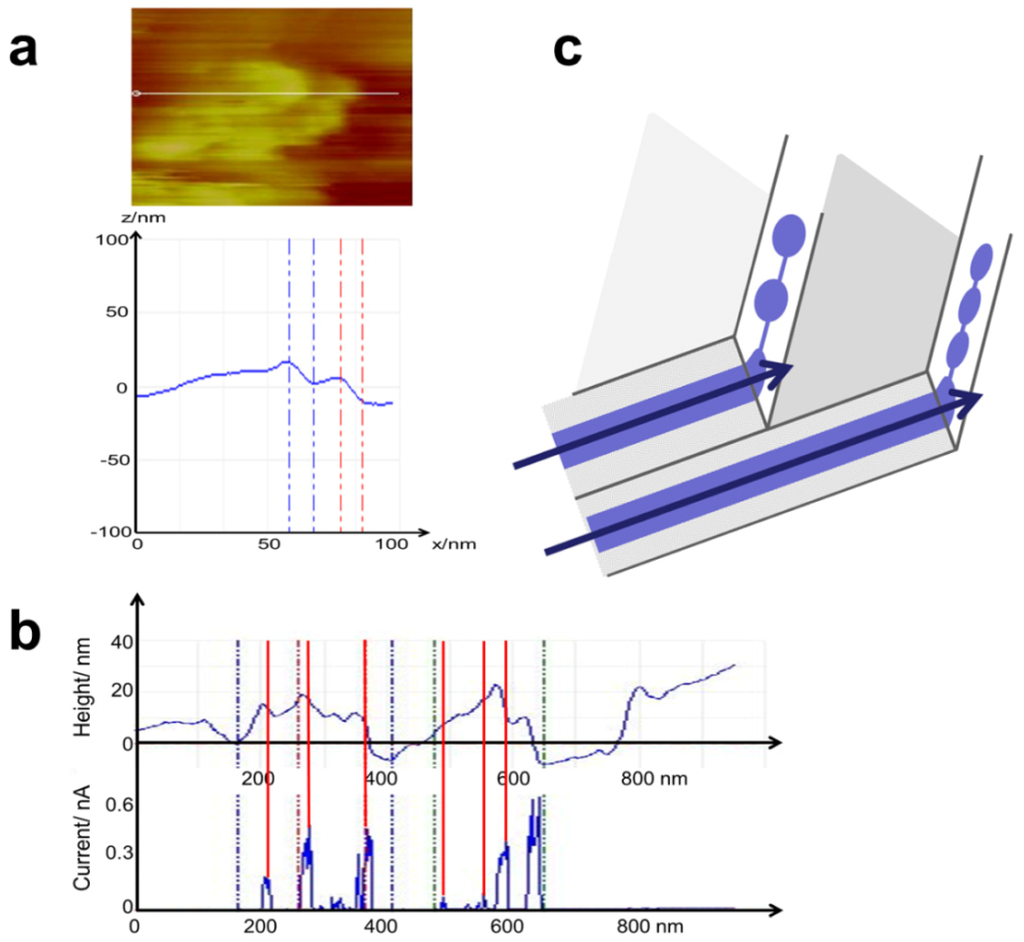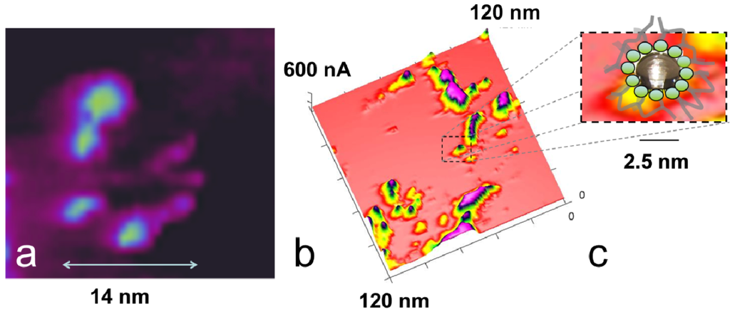 Figure 14a shows a spiral conductive nanostructure with a diameter of 14 nm formed by partly connected and partly isolated ionic current spots with a diameter that decreases from 5.2 nm for the larger left four spots and to approximately 1.6 nm for the spots on the right side. The two bright current spots are separated by 1.5 nm, and a small spot is located between them. The diameter of the non-conductive center is approximately 4–5 nm. This structure could be interpreted as being formed from a cylindrical fiber of polymer backbone with exterior sulfonic acid groups, most likely surrounded by other fibrillar bundles of polymer backbone. The space is filled with water and displays current spots. These spots can be differentiated by some highly active current spots but appear to be connected by a smaller current. The different orientation and density of the sulfonic acid groups outside the fibrils may lead to the formation of more or fewer connected conductive water channels between them. Although their diameter fits the model prediction of Schmidt-Rohr [10], their conductive connection is in disagreement with this model. These spirally shaped structures are frequently found in our current images of Nafion®. Linear structures are also visible in Figure 14b with no isolated current spots but an approximately homogeneous current. This observation indicates the presence of water sheets, which also fits the model proposed by Gebel and Diat [12]. The existence of elongated water sheets is also supported from the time-dependent measurements in Figure 13: The conductive spots visible after 18 min are partly connected and form curved lines, which is consistent with the inclusion of water between sheets of the polymer backbone.