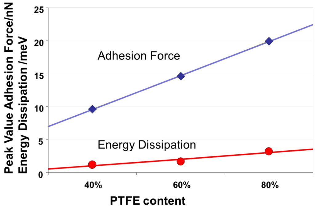 The dependence of adhesion forces and energy dissipation measured by AFM has been investigated and calibrated using a series of samples prepared with various controlled ratios of Teflon (PTFE) to carbon. These results are used as an analogy to better understand the increase of adhesion in the Nafion® polymer. These samples were used as a model system with different amounts of hydrophobic PTFE (as found in the backbone of Nafion® molecule) and carbon at the surface. They were analyzed by AFM in QNMTM tapping mode in ambient air under ambient (dry) conditions. The statistical evaluation of the mean energy dissipation and the mean adhesion force as a function of the amount of PTFE with a confidence level 95% leads to a linear increase in both properties with increasing PTFE (Teflon) content, as shown in Figure 8 [23].