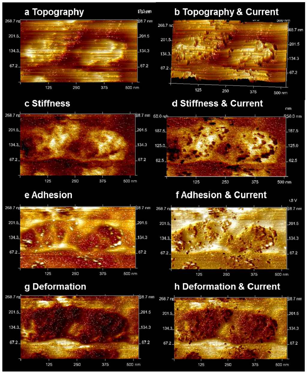 In Figure 9, starting from the top, the topography (a), the DMT stiffness (b), the adhesion force (c), and the deformation (d) in a smaller area (500 × 500 nm) of Figure 6 are shown on the left side.