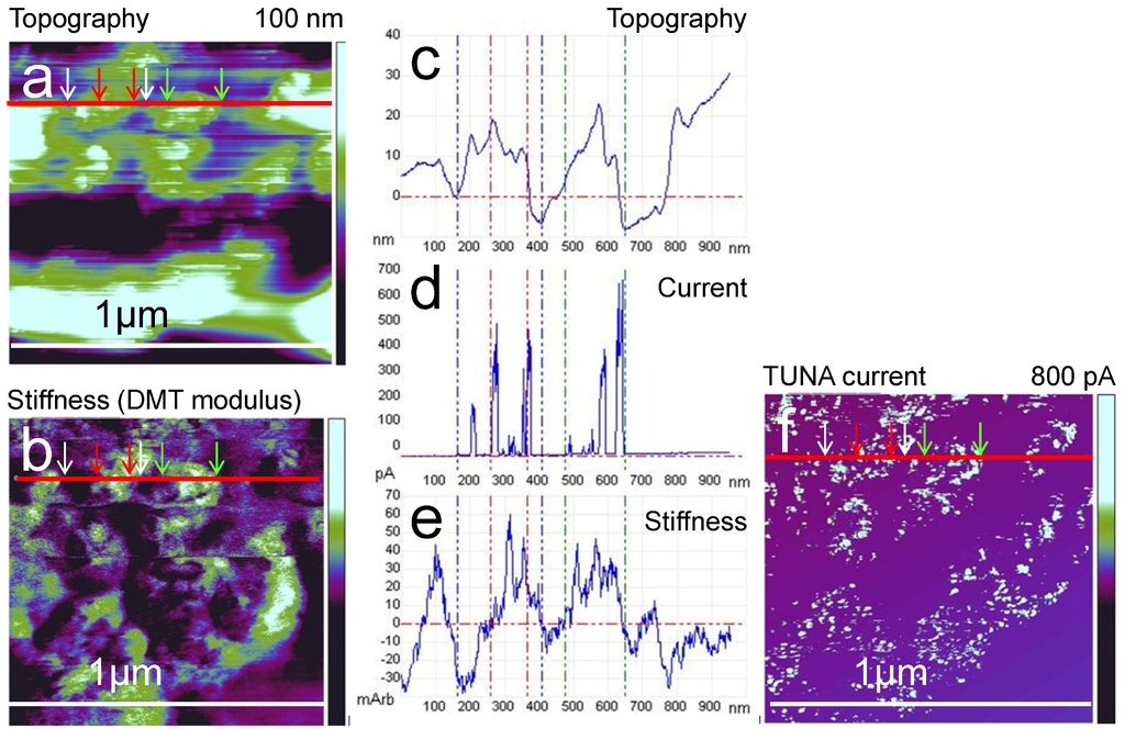 On the right side, in Figure 9b,d,f,h, the current signal is subtracted from the left image, and the sites where current is detected are visible as black spots. In the topography image (Figure 9a), two of the larger protrusions (approximately 150 nm in size) are imaged; as previously discussed; the current flow is mainly located at the margins of the protrusions, and most of the current is recorded directly at the vertical steps. Notably, spots of very high adhesion (white spots Figure 9f) are observed, which are in the vicinity of the current signal. On the left side of Figure 10b, the stiffness signal of this area is given. The protrusions have a stiffness that is clearly higher than that of the surrounding area and thereby distinguishable. Inside the area of the protrusions, the stiffness signal also varies. On the right side, where the current has been subtracted from the stiffness image, the greatest stiffness is measured just between the current spots. Interestingly, the stiffness is somewhat lower directly at the position of the current spots. The adhesion force in Figure 9e, left side, exhibits a significantly smaller value at the protrusions. As previously mentioned, a few bright spots with very high adhesion are visible. A comparison of the conductive spots with the adhesion signal (right side) shows a coincidence of the white spots with the larger current spots. The whole area exhibits a small deformation (Figure 9g), with the smallest values at the position of the current spots visible at the right side. This mechanical property (high adhesion and low deformation) is explained by the small compressibility of liquids such as water, which obviously cannot be squeezed by the AFM tip during the short contact time. Therefore, we interpret the high adhesion spots as water droplets that result from the current flow and the associated water transport. For a direct comparison, the profile lines of topography, current, and stiffness (DMT) are given in Figure 10.